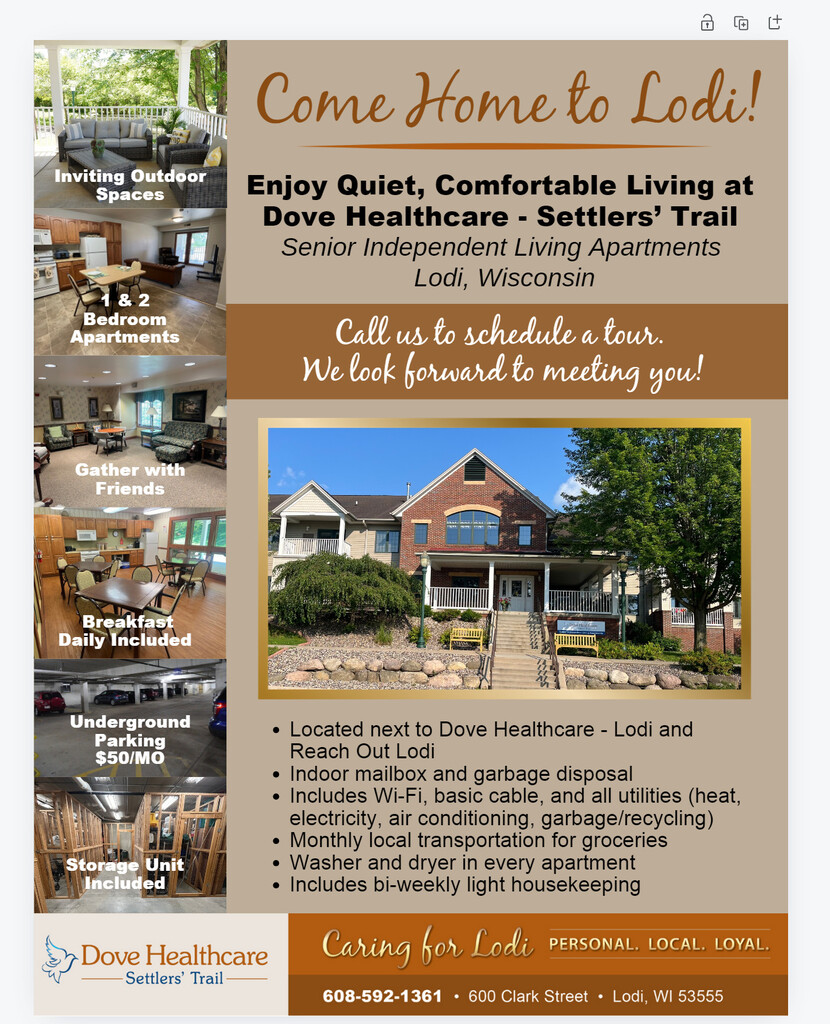 Dove Healthcare - Settlers’ Trail is a senior living (55+) apartment community located just 30 minutes north of Madison in beautiful Lodi, Wisconsin. Nestled at the edge of town, Dove Healthcare Settlers’ Trail is a beautiful building with an activity room, library/TV room, exercise room, and an underground heated garage (additional fee for parking) with elevator to all floors. Noon meal included in rent! Each apartment comes with a storage unit, spacious floor plans, full-size kitchen (including dishwasher, microwave, range, garbage disposal, and refrigerator), and a washer and dryer in each apartment. Spectrum TV and WIFI included! Window blinds are included! Our tenants enjoy priority access to Dove Healthcare - Lodi, right next door! Physical therapy and a salon are also available on campus. See the amenities for all that's included!