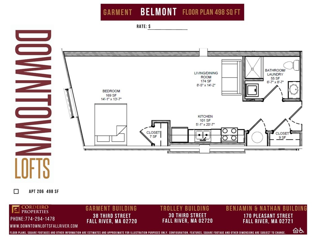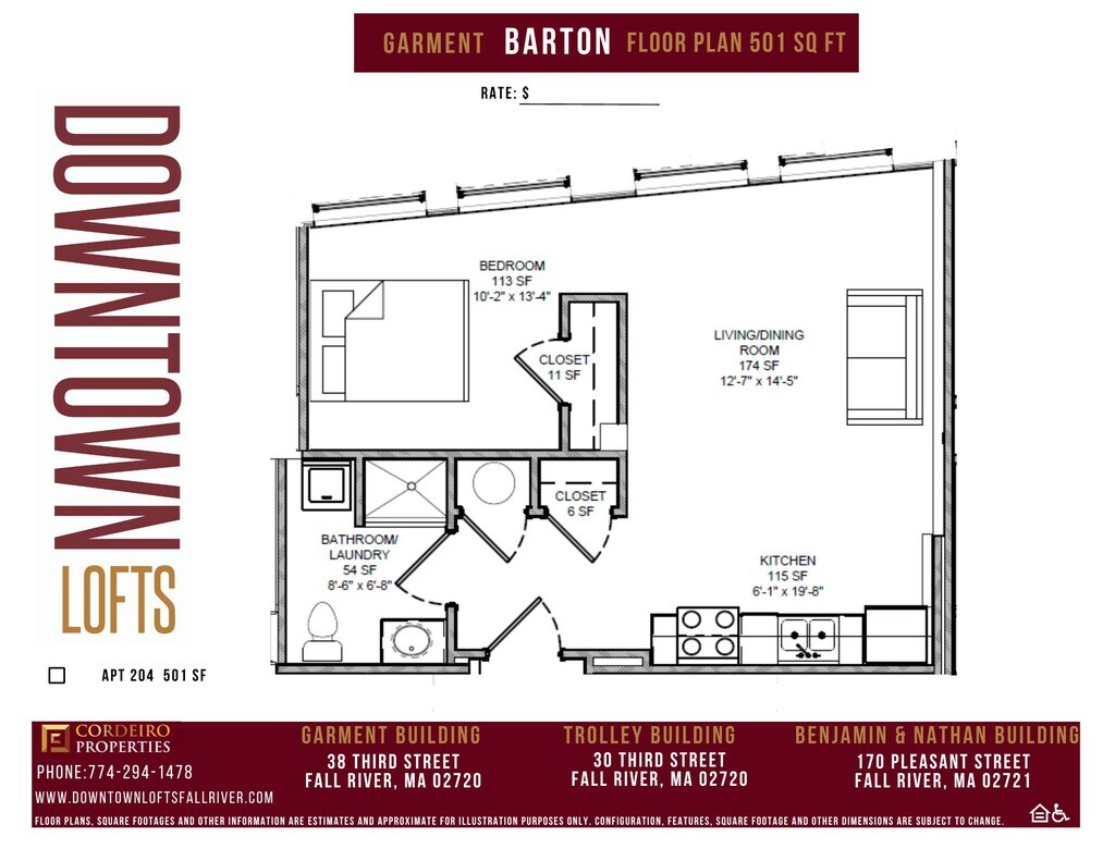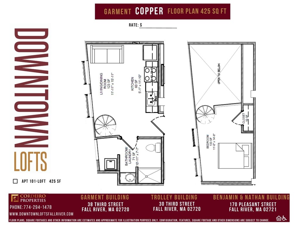 Downtown Lofts introduces a fresh elevated living experience to downtown Fall River. Masterful design and modern luxury are uniquely paired to transform the historic Benjamin & Nathan, Trolley Building, Garment Building, and Merrill Building into the new home you deserve! Our brand new apartment homes feature stainless steel appliances, granite counter tops, in-home laundry, and an abundance of sunlit windows. Choose from our carefully curated floor plans for the style that meets your needs. Benjamin & Nathan building offers a sleek contemporary design with premium white cabinetry, chrome finishes, and restored hardwood flooring. Trolley building offers a modern rustic design with dark chestnut cabinetry, bronze finishes, and soaring high ceilings. While the Garment building offers a unique design with dark chestnut cabinetry, chrome finishes, granite counter tops, and historic attributes that highlight Fall River's Garment workers past. The Merrill Building offers spaces where old-world charm meets modern luxury—refinished original hardwood floors, soaring ceilings, dark chestnut cabinets with sleek chrome fixtures, stainless steel appliances, and stunning loft windows that flood your home with natural light. These ideal locations give you immediate access to a variety of attractions including shopping, dining, entertainment and more! Downtown Lofts is a commuter's dream, conveniently located minutes away from Rt. 195 and Rt. 24 We are always accepting applications for our affordable apartments. Monthly rent $1,423. Income limits apply. Call for details or to request an affordable application to be sent to you.