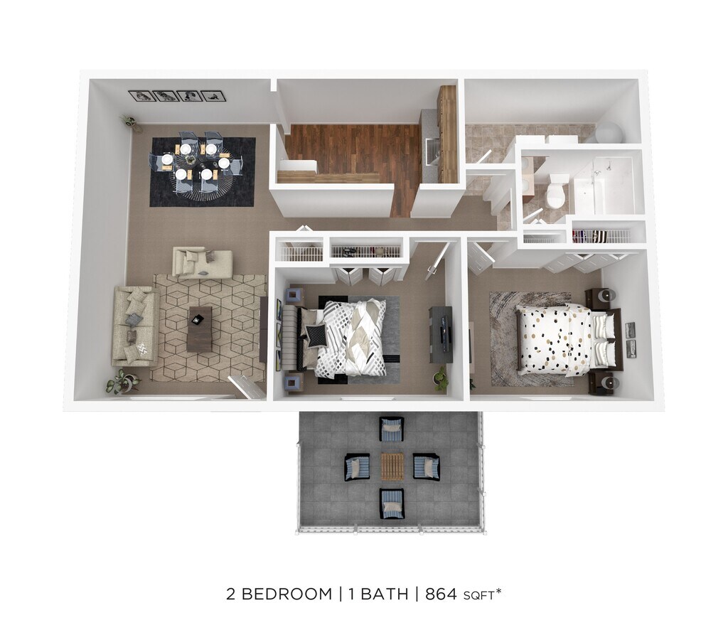 2 Beds, 1 Bath, 864 sq ftAvailable May 1Model Gallery