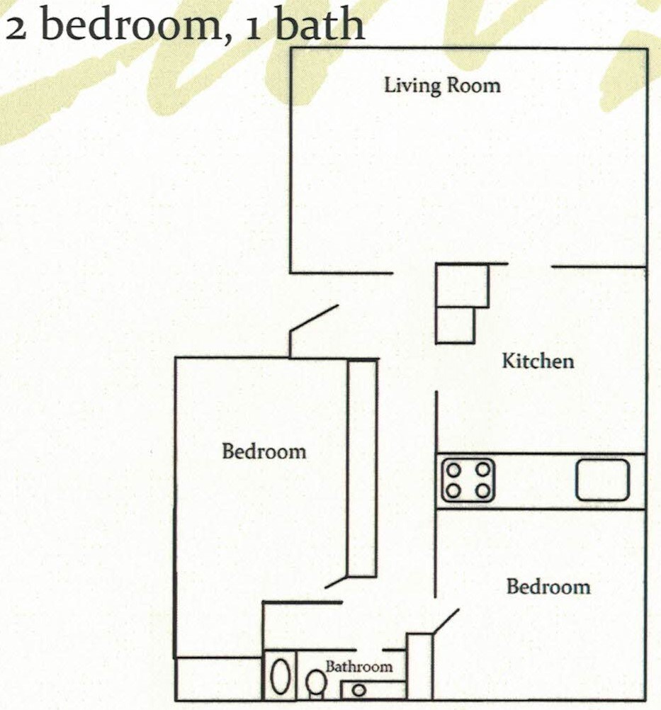 - 2 Bedrooms- Floorplan 2x12 Beds, 1 Bath, 800 sq ft- Model Gallery- Floorplans- Photos- Availability Details- Price - Availability Date - Unit - Sq Ft - $1,395 - Call for Availability - 2x1 - 800 sq ft - Model Amenities and Features- Features- High Speed Internet Access