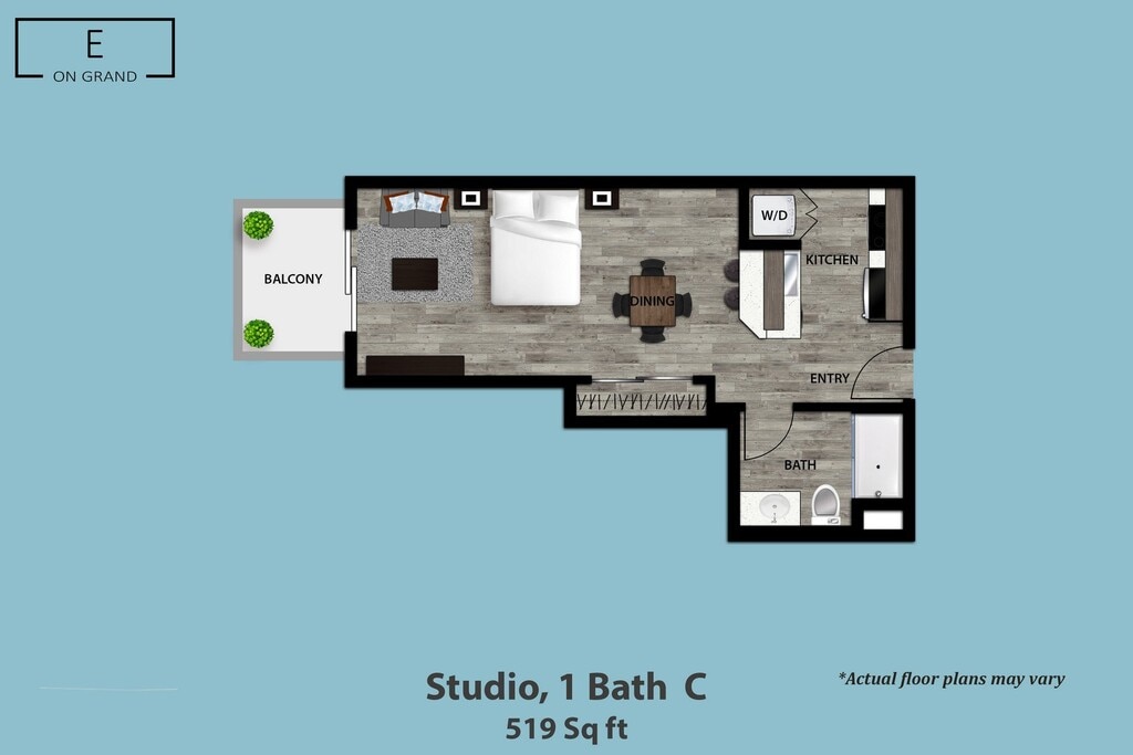 E On Grand offers Studio to 2 Bedroom apartments starting from $1,900 and having 481–1,218 sq ft. Here is the current pricing and availability: