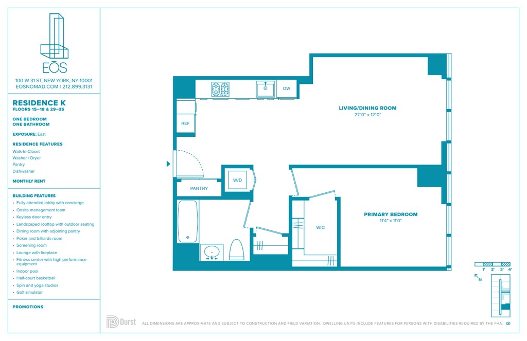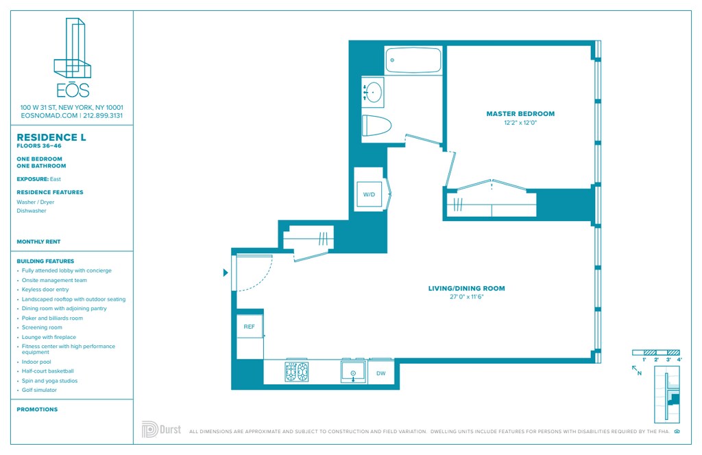 Located at 100 West 31st Street, EOS offers distinctive residences, curated amenities, and the personalized service needed to engage New York City life to the fullest - inside and out. Premier recreation and relaxation facilities for residents to enjoy include a pool, fitness center on the lower level, as well as a game room and entertaining areas on the tower’s 47th floor with sweeping views of Manhattan. EOS offers 375 smoke-free rental residences consisting of studios, one, two, and two bedroom + den layouts. Each apartment contains a washer/dryer, dishwasher, hardwood floors, and kitchens and bathrooms with premium finishes and fixtures. Consistent with The Durst Organization’s ongoing commitment to sustainability, EOS offers residents a vision of sustainability that both respects the natural world and promotes your wellbeing. Centered around the four core elements - Water, Air, Earth, and Energy - EOS gives back to the environment and provides a home where people can thrive. Sustainable features have been woven throughout the building and each residence as an integral part of its design, construction and management. Stepping out from inside EOS, some of the most desirable neighborhoods await. Electric NoMad, with its mix of restaurants, hotels, and boutiques, is at your doorstep. Stroll to Midtown, Bryant Park, the Flatiron District, Chelsea, and the Meatpacking District. EOS residents are also within a five-block walk to the following transit lines: 1, 2, 3, 6, B, D, F, M, N, Q, R, W, A, C, E, PATH, Amtrak trains, and various bus routes. EOS provides residents the best that New York City has to offer, both inside and out. Come discover a neighborhood that immediately feels like home. FARE Act Disclosure. This listing is intended to be used by prospective renters and may not be republished without the prior written consent of The Durst Organization. Absent an express written agreement or acknowledgment to the contrary, The Durst Organization and its affiliates (1) do not utilize the services of third-party brokers or agents in connection with the rental of residential apartments and (2) will not assume responsibility for any brokerage fees incurred by a prospective renter. The Durst Organization and its affiliates will not charge or collect fees from a prospective renter except for such fees as permitted by law and disclosed to the prospective renter.