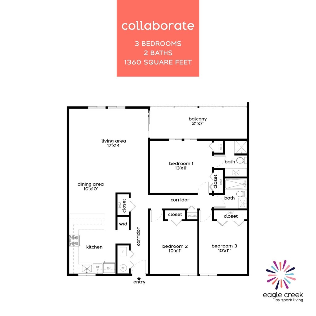 Collaborate - Floorplan 1 Apartment Unit: E140Apartment Model: 3 Beds, 2 baths$1,6153 Bedroom, 2 Bath, 1360 sq ftAvailable Now
