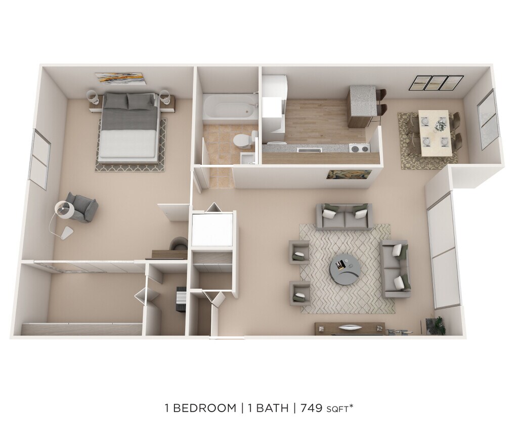 Apartment Model: One Bedroom- 749 sqftFrom $1,1601 Bedroom, 1 Bath, 749 sq ftAvailable Now![]()