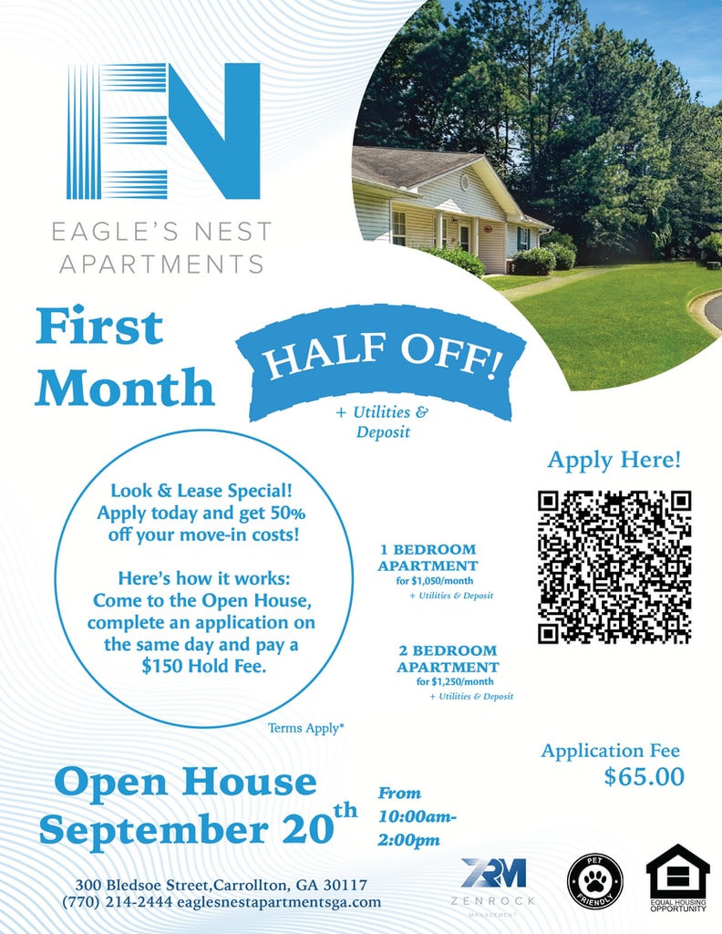 Step into spacious comfort with our 2-bedroom, 1-bathroom apartments at Eagles Nest, designed for those who want extra room to live and relax. Whether you're sharing space or need a dedicated home office, this layout offers flexibility and function. Enjoy ground-floor, single-story living with in-unit washer and dryer hookups and a warm, inviting atmosphere. Our professionally managed community includes a playground, laundry facility, and easy access to Carrollton’s best parks, shops, and restaurants. With the University of West Georgia nearby and a simple commute to Atlanta, this is the ideal place to call home.