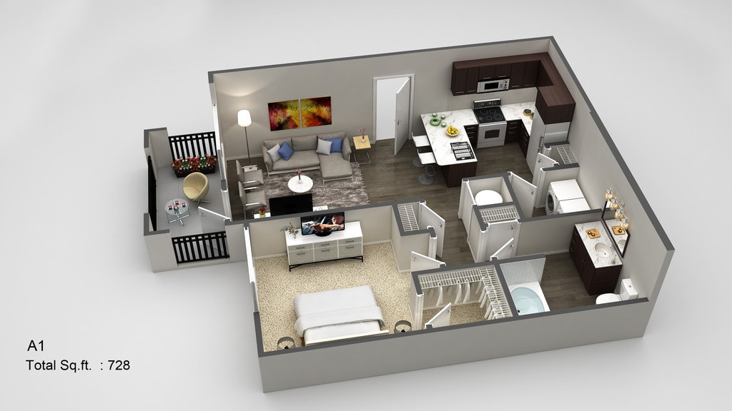 1 Bed, 1 Bath, 728 sq ftModel Gallery