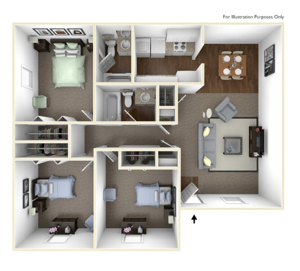 Apartment Model: 3b3 Bedroom, 2 Bath, 1100 sq ftUnavailable3b - Floorplan 1