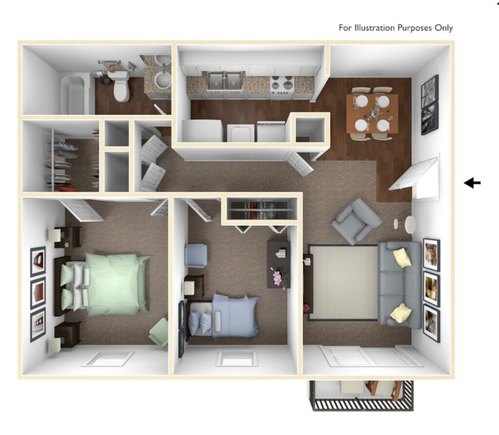 Apartment Model: 2b2 Bedroom, 1 Bath, 907 sq ftUnavailable2b - Floorplan 1 3 Bedrooms