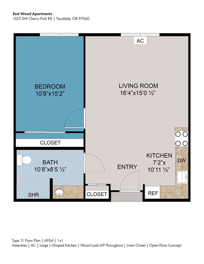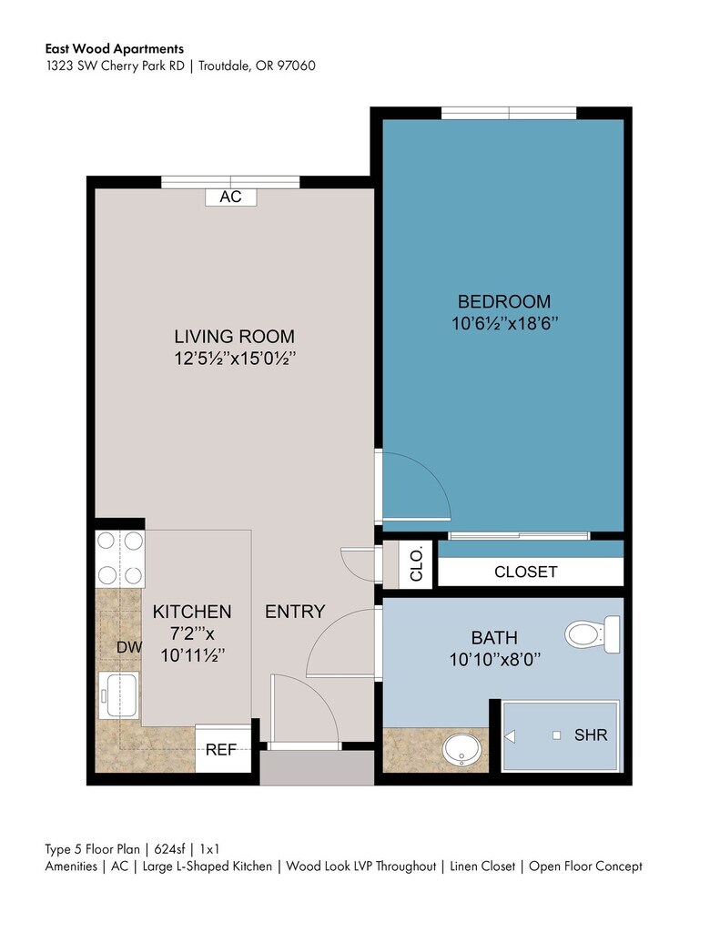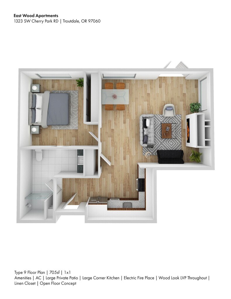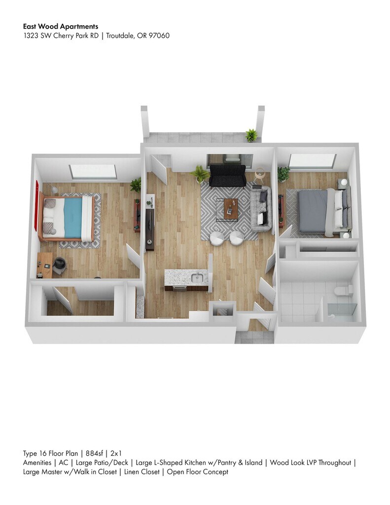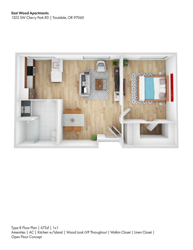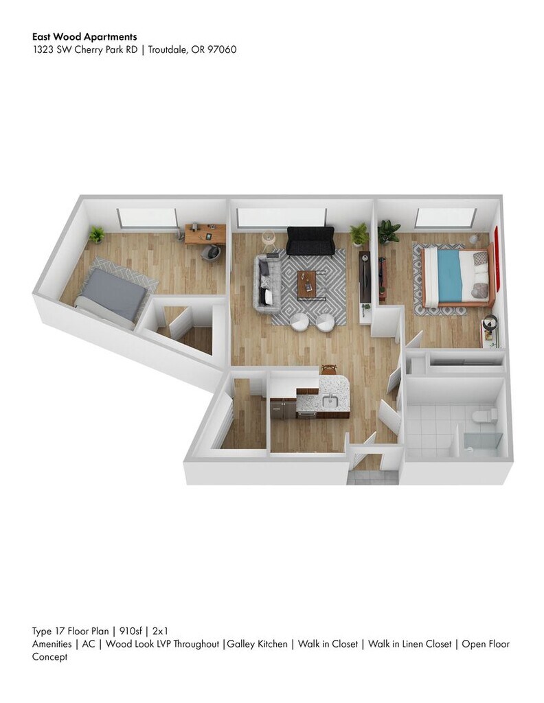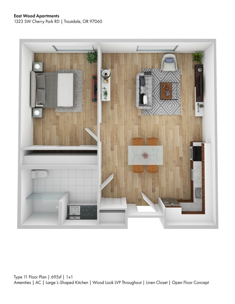 Find your perfect fit in our beautifully designed studio, one-, and two-bedroom apartments, offering all the modern comforts you need in a community connected to both nature and the heart of Troutdale. Eastwood places you close to it all: stroll to downtown Troutdale’s charming shops and the vibrant new Troutdale Station food cart hub, or head just minutes away to Edgefield McMenamins, a local landmark with live concerts, multiple restaurants and bars, a spa, and even a par-3 golf course. And with the Columbia River Gorge just beyond, outdoor adventure is always within reach. When you’re home, you’ll enjoy amenities designed to enhance your lifestyle. Stay active in the fully equipped fitness center or stretch out in the yoga room. Catch a film in the private theater, work remotely in our dedicated coworking space, or gather with friends in the lounge and game room. Pet parents will love the convenient on-site pet wash station, and extra storage is simple with rentable storage units, bike racks, and secure package lockers. At Eastwood, modern living meets small-town charm, offering not just a home, but an experience.
