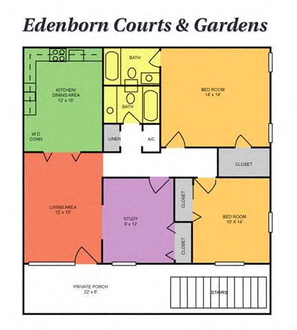 Behind the French doors and painted shutters of Edenborn Courts & Gardens lies a great neighborhood setting for families and friends. These large two bedroom two-bath with den apartments are conveniently located within walking distance of Lakeside Shopping Center, public transportation and I-10.