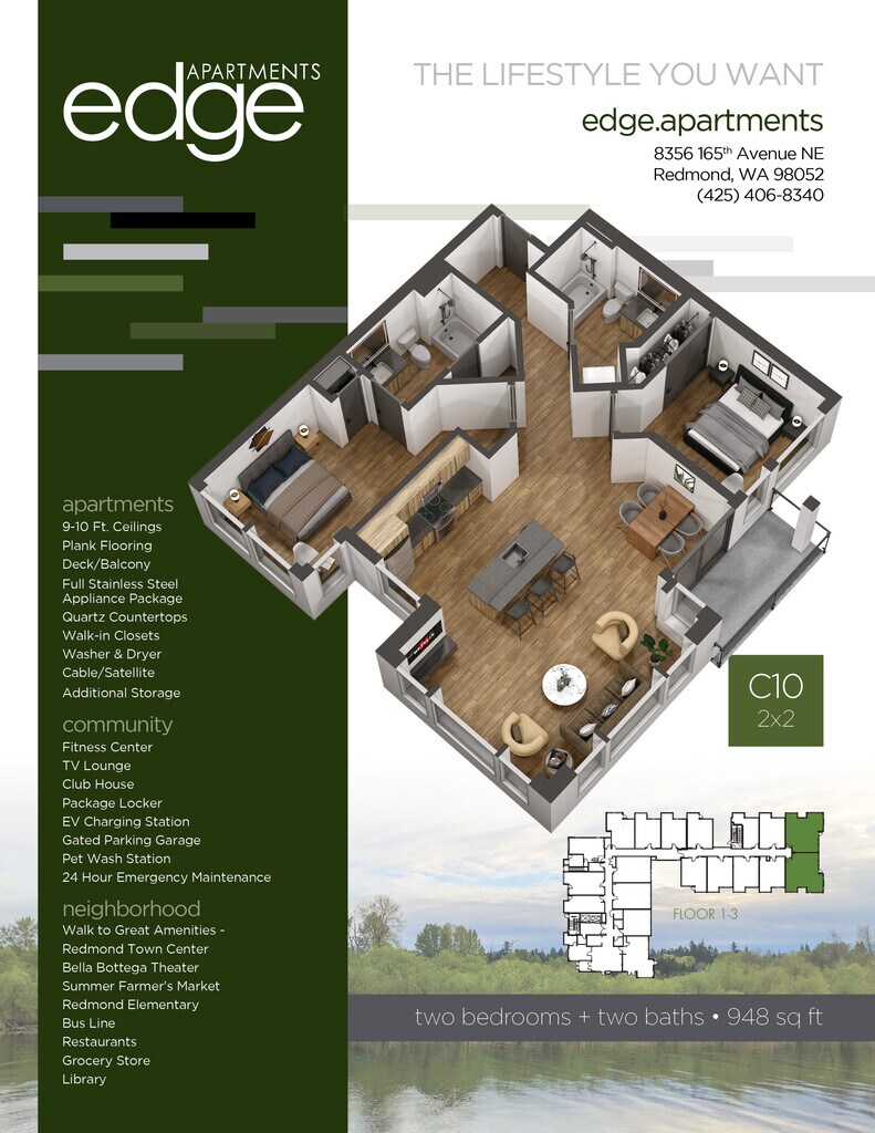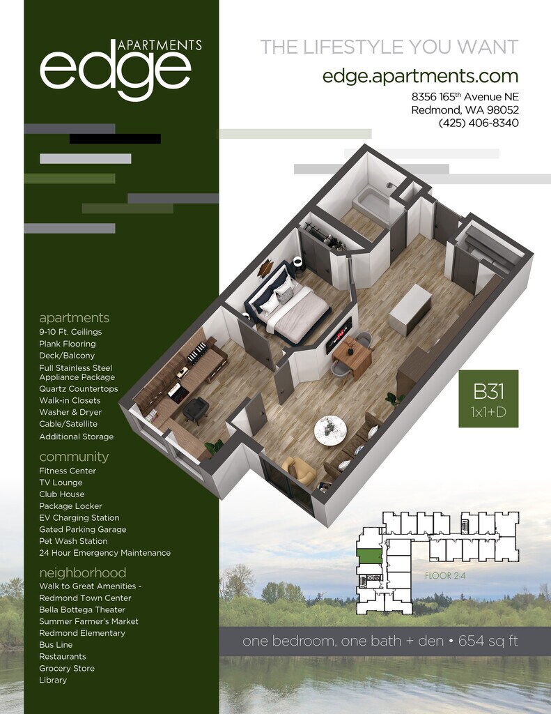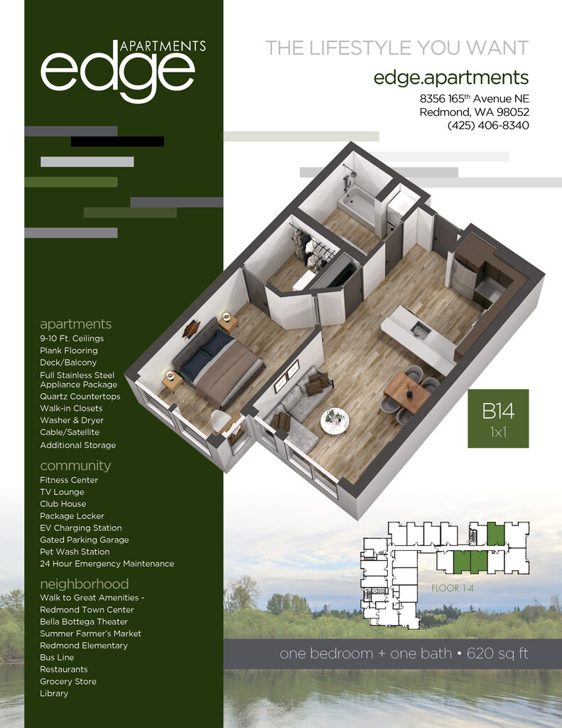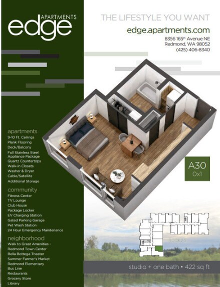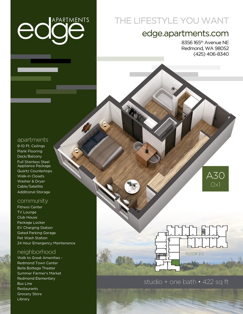 Welcome to Edge Apartments - a beautiful, boutique community in Redmond. Walk to Redmond Town Center & Bella Bottega! Next door to Redmond Elementary. On bus line, walking distance to library, restaurants, grocery theater, and more. Pet and people friendly - excellent customer service (we love our residents) Apartments will include digital thermostats, upgraded stainless appliances, front-load energy efficient washer & dryer in every home, digital entry, kitchen islands, hard-surfaced flooring, TONS of windows just to name a few.