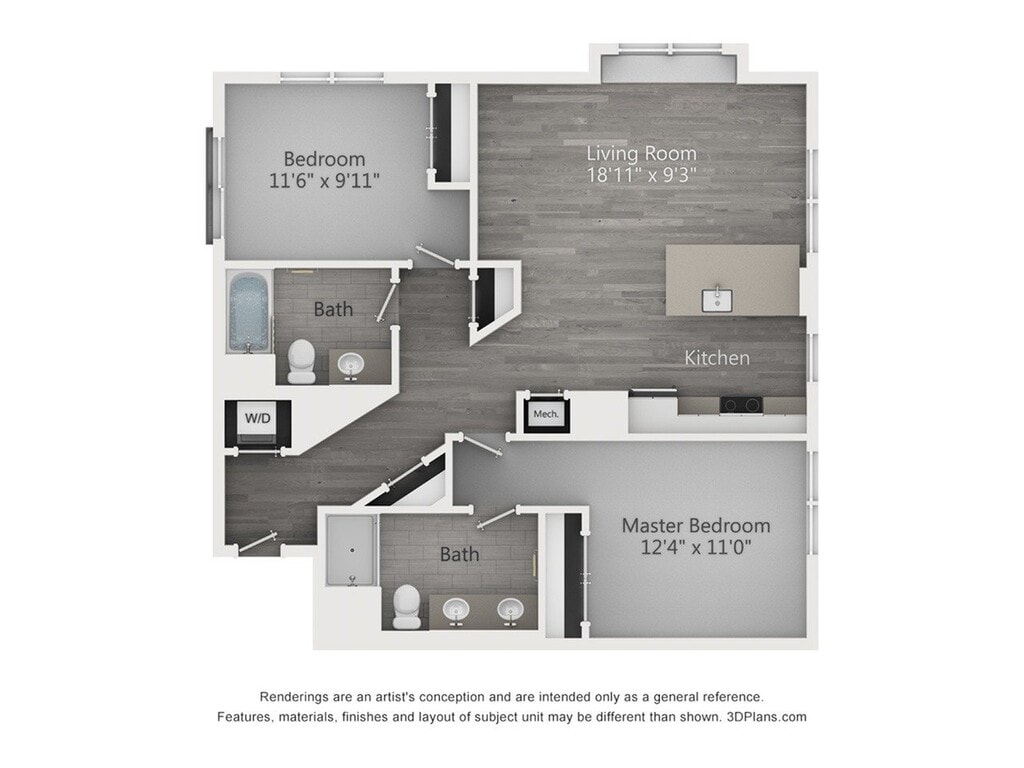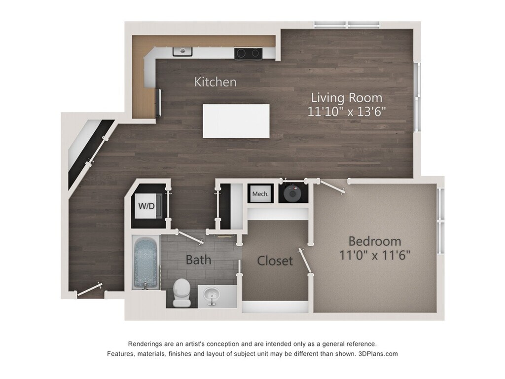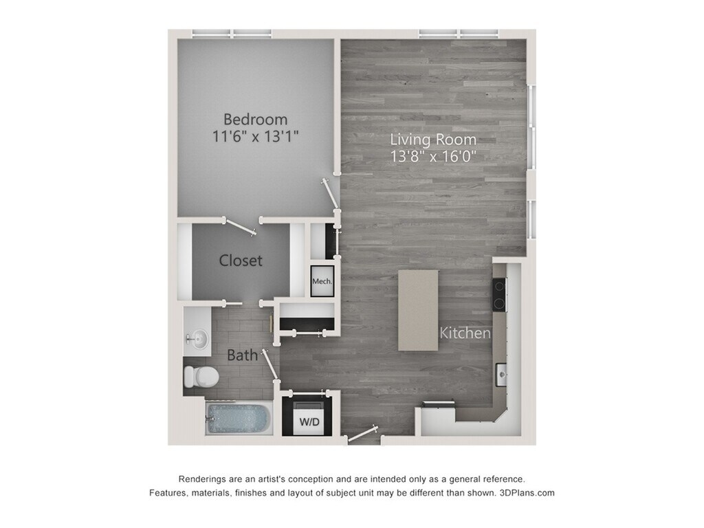 Apartment Model: One Bedroom One Bathroom (713 SF)From $2,4861 Bedroom, 1 Bath, 713 sq ftAvailable NowFloor plans are artist's rendering. All dimensions are approximate. Actual product and specifications may vary in dimension or detail. Not all features are available in every rental home. Please see a representative for details.