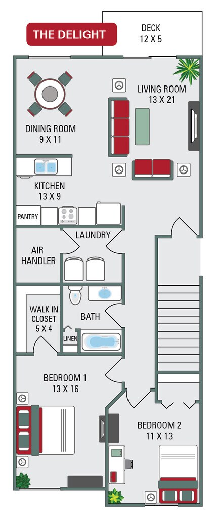 Apartment Model: The DelightFrom $1,4752 Bedroom, 1 Bath, 1094-1118 sq ftAvailable Now![]()