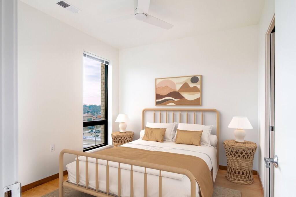 1 Bedroom Income Restricted - 80% Level Moderate-income and student status restrictions apply. Maximum income is determined by household size and is based on gross annual (pre-tax) income. 1 Person - less than $72,720 2 People - less than $83,120 Unit cannot be entirely occupied by full time students. Some exemptions apply - contact us for details. B - D Floor Plan - Southeast Facing Apartment Features Include - In-Unit Washer and Dryer - Kitchen Island - Oversized Windows - Solid Surface Countertops - Stainless Steel Appliances - Subway Tile Backsplashes - Tub/Shower Combo - Vinyl Plank & Tile Flooring - Walk-In Closet - Window Coverings Tenant Liability Insurance Required. (Minimum coverage of 100K) (Pricing, inclusions and eligibility subject to change)