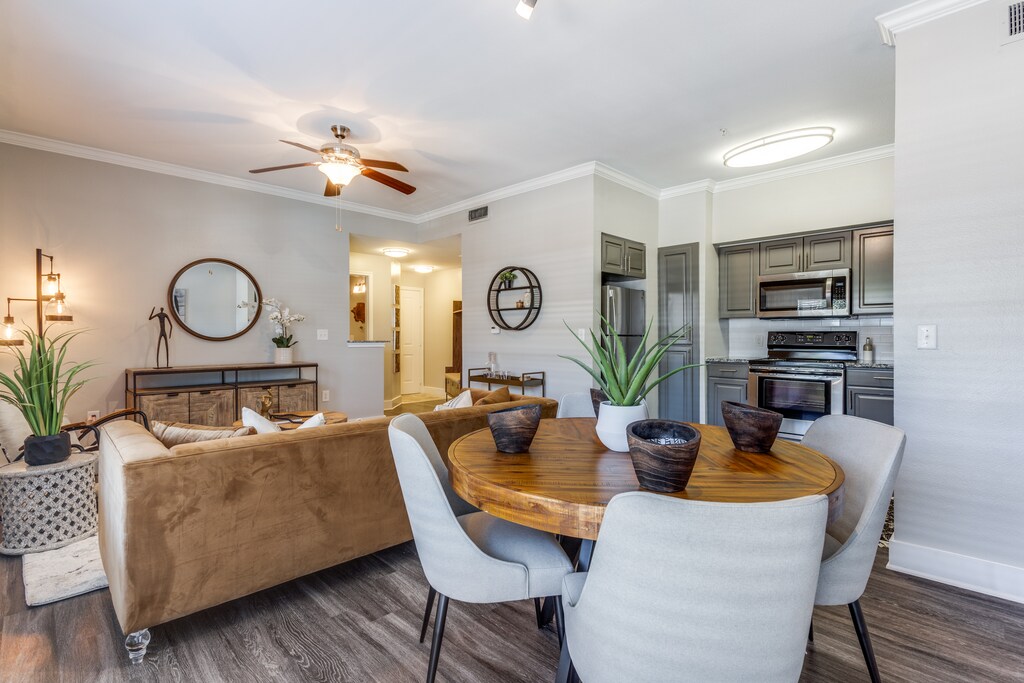 Ellwood at Lake Travis features a range of thoughtfully designed one, two, and three-bedroom apartments, including townhome-style layouts with private attached garages. Each residence boasts modern interiors with stainless steel appliances, granite countertops, and spacious living areas. Select homes offer private fenced backyards, oversized windows, and up to 15-foot ceilings, enhancing the sense of space and comfort