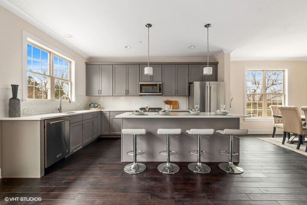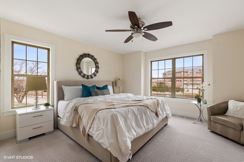 High-end three bedroom townhome in a picturesque setting and walking distance to the Metra and downtown Deerfield. Enjoy well-lit, open floor plans with 9' ceilings and beautiful Oak floors on the main and lower levels. The kitchen is a culinary delight with a breakfast bar, 42" upper cabinets, and stainless steel appliances. The master bedroom boasts a spacious walk-in closet and a full bath with double bowl sinks. Conveniently, the laundry room is on the bedroom level. Each townhome includes a 2-car attached garage and energy-efficient heating and cooling. Highlights include taupe-stained oak floors, upgraded bedroom carpet, white cabinets, quartz kitchen counters, Kitchenaid SS appliances, double-bowl quartz vanity tops, private deck, and bedroom ceiling fans. Pets welcome, limit 1 cat/dog. ***Pictures are of model unit finishes are of the same quality but may vary slightly.