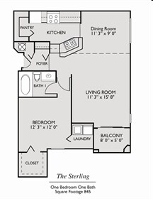 Apartment Model: SterlingFrom $1,4021 Bedroom, 1 Bath, 846 sq ftAvailable NowFloor plans are artist's rendering. All dimensions are approximate. Actual product and specifications may vary in dimension or detail. Not all features are available in every rental home. Prices and availability are subject to change. Base rent is based on monthly frequency. Additional fees may apply, such as but not limited to package delivery, trash, water, amenities, etc. Deposits vary. Please see a representative for details.