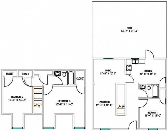 Apartment Model: 3 Bedroom 2 Bath TH W/Patio3 Bedroom, 2 Bath, 1560 sq ftAvailable Now![]()