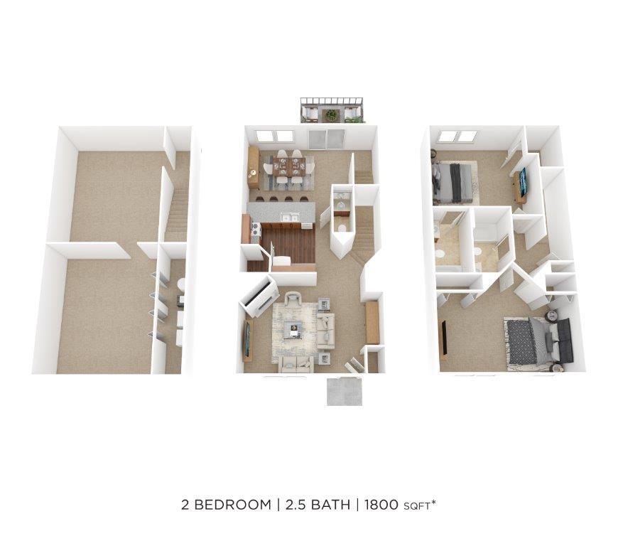 Apartment Model: Two Bedroom 2.5 Bath Townhome- 1800 sqftCall For Rates2 Bedroom, 2.5 Bath, 1800 sq ftUnavailable![]() - Two Bedroom 2.5 Bath Townhome- 1800 sqft - Floorplan 1 ![]() - Two Bedroom 2.5 Bath Townhome- 1800 sqft - Floorplan 2