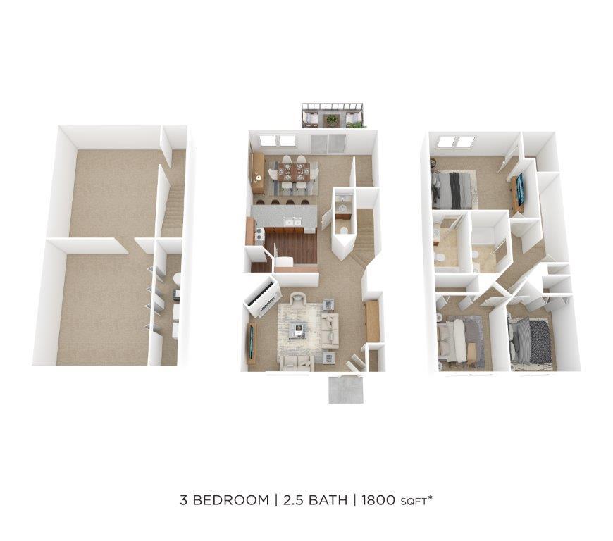 Apartment Model: Three Bedroom 2.5 Bath Townhome- 1800 sqftCall For Rates3 Bedroom, 2.5 Bath, 1800 sq ftUnavailable![]() - Three Bedroom 2.5 Bath Townhome- 1800 sqft - Floorplan 1 ![]() - Three Bedroom 2.5 Bath Townhome- 1800 sqft - Floorplan 2