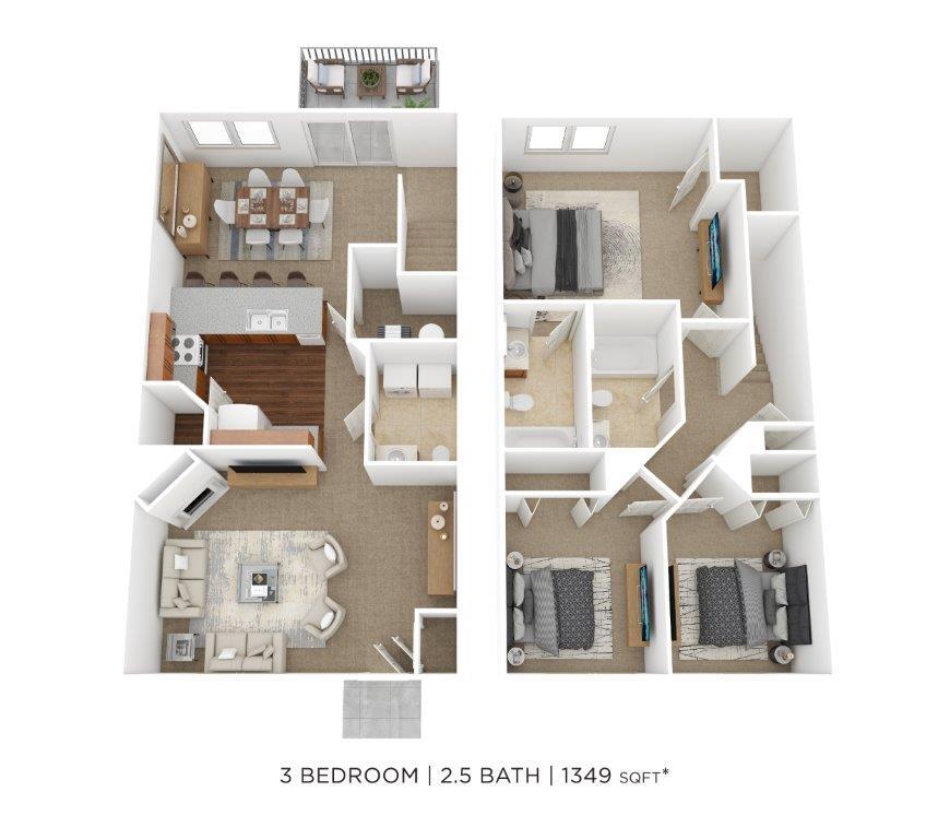 - 3 BedroomsShow Unavailable Floorplans- Three Bedroom 2.5 Bath Townhome- 1349 sqft- From $2,0453 Beds, 2.5 Baths, 1349 sq ftAvailable NowCheapest 3 BedroomThis is the cheapest 3 Bedroom at this Property- Model Gallery- Floorplans- Availability Details- Price - Availability Date - Unit - Sq Ft - $2,135 - Available Now - AM1120 - 1349 - $2,045 - February 5, 2026 - AM1192 - 1349 - Model Amenities and Features- Features- Air Conditioning