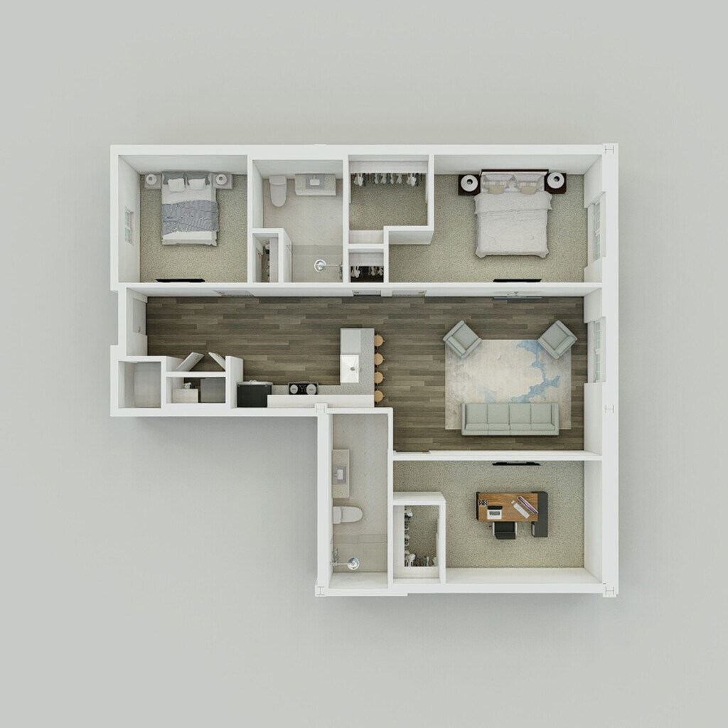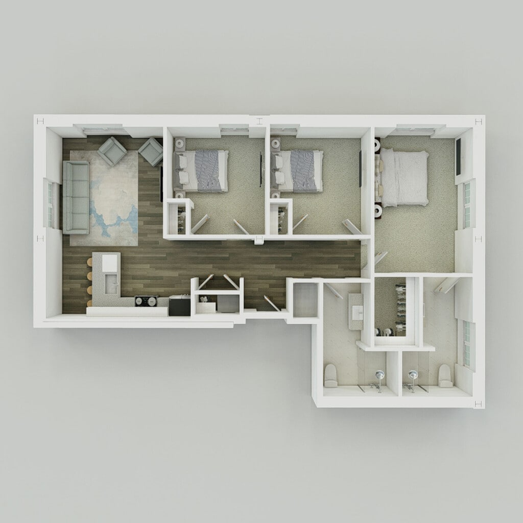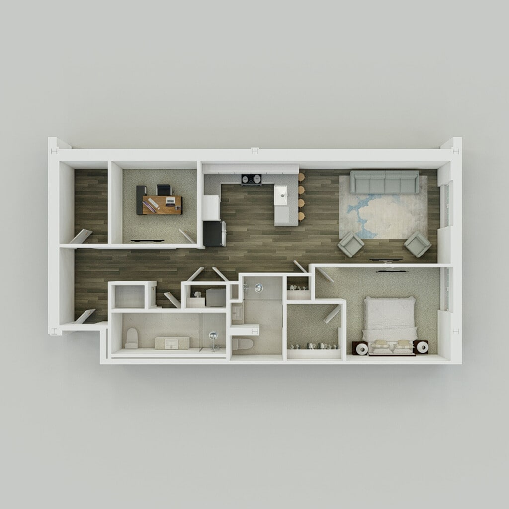 1 Bed, 2 Baths, 1037-1207 sq ftAvailable NowLargest 1 BedroomThis is the largest 1 Bedroom at this PropertyModel Gallery