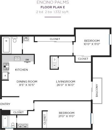 Apartment Model: E Floor Plan$3,1252 Bedroom, 2 Bath, 1332 sq ftAvailable NowE Floor Plan - Floorplan 1 D Floor Plan