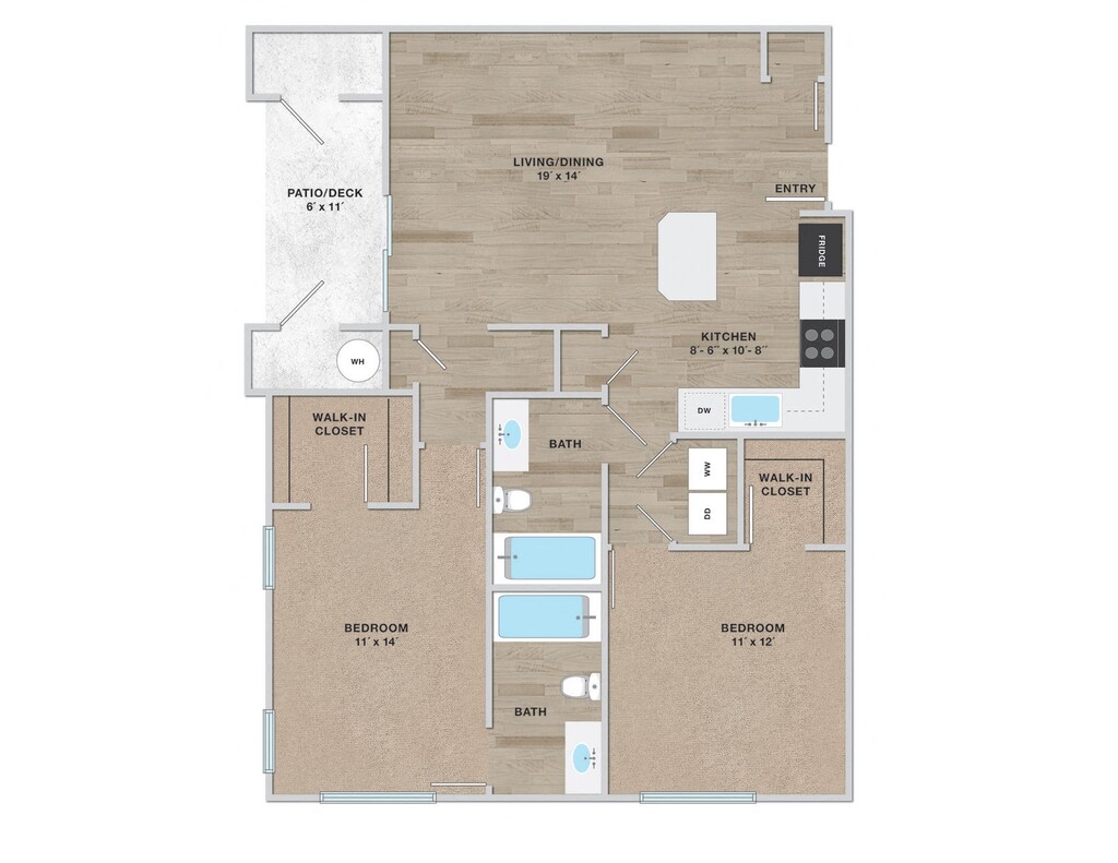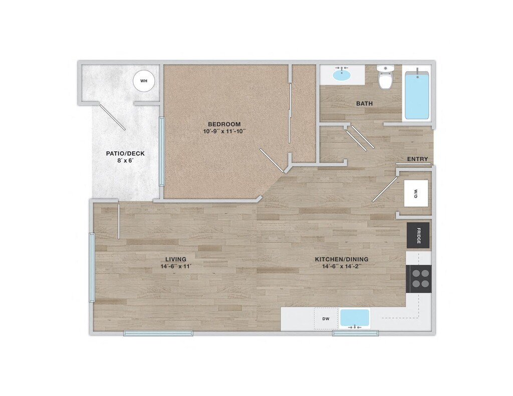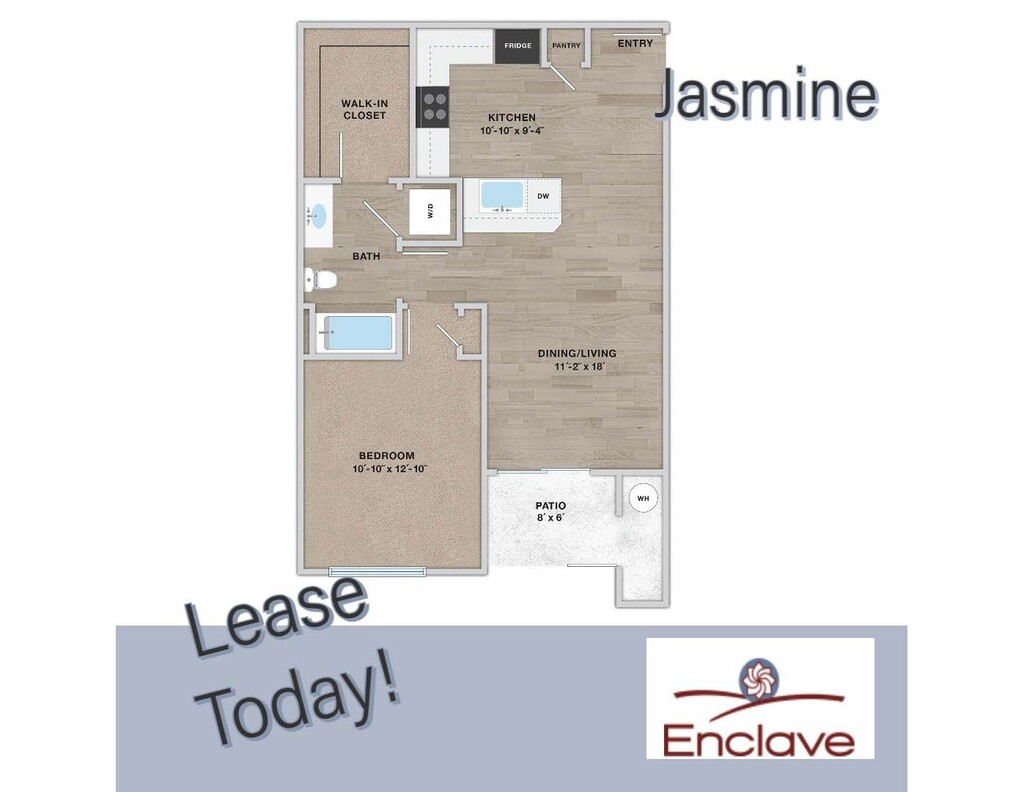 Jasmine, 1 x 1, 735 sq. ft. Hardwood-style flooring with carpet in bedroom. Walk-In Closet, Nine-foot ceilings. In-unit stackable Washer and Dryer. Refrigerator with Ice maker, Pantry, Dishwasher, Disposal, and smooth top electric Range with microwave hood. Designer window coverings. Soundproofing between apts. Energy-efficient heating and cooling. Patio or Deck. Cable ready.