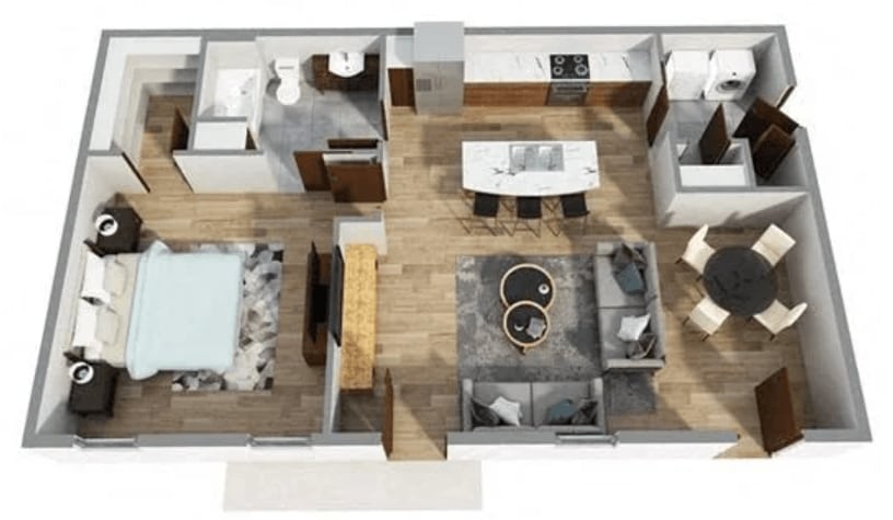 Apartment Model: The Bluffton w/ Garage$2,0281 Bedroom, 1 Bath, 797 sq ftAvailable March 28, 2026Floor plans are artist's rendering. All dimensions are approximate. Actual product and specifications may vary in dimension or detail. Not all features are available in every rental home. Please see a representative for details.