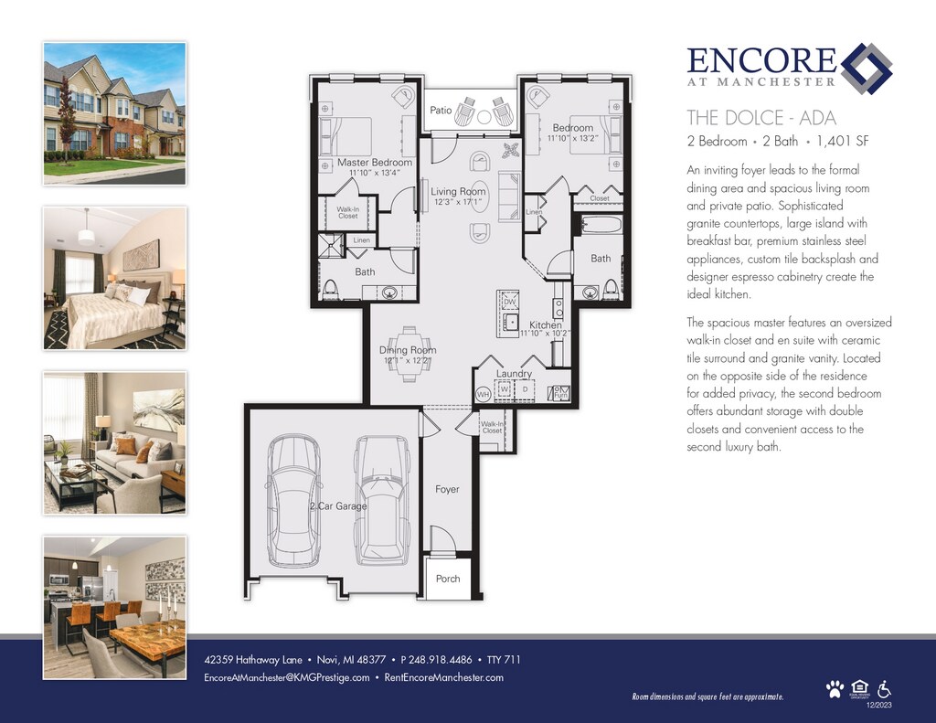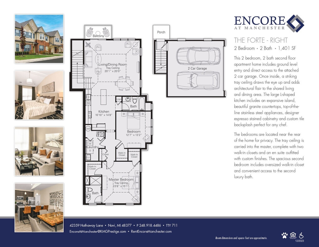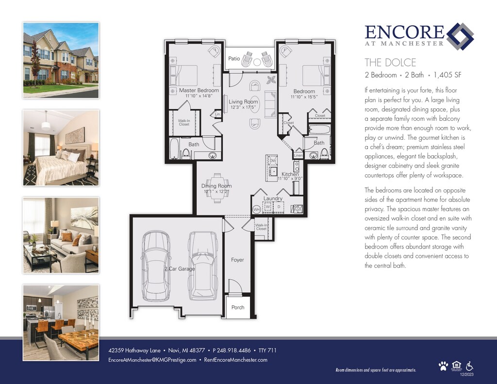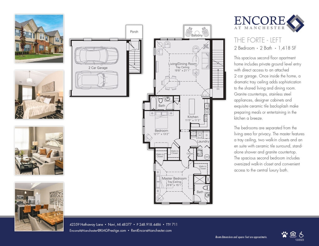 Sophisticated design, refined features and superior amenities, Encore at Manchester is setting the stage as Novi’s premier, upscale community. Open floor plans, planked flooring, sleek gourmet kitchens, granite counter tops, stainless steel appliances and contemporary finishes add a duet of substance and style. Unique conveniences include a full-size washer and dryer in every apartment, private entrance with private balcony or patio for outdoor living, attached 2 car garages and the latest technology.