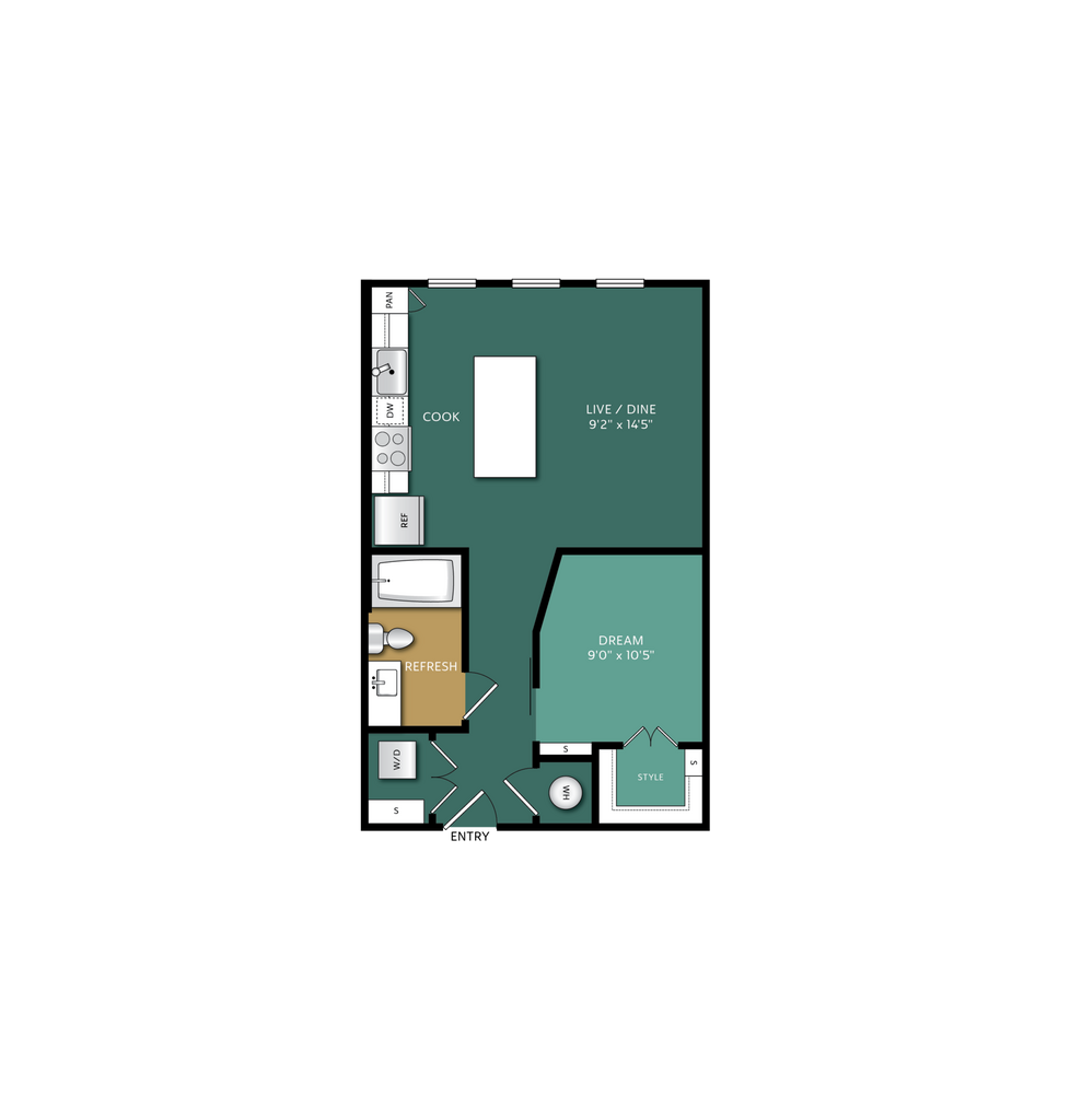 S1 - Floorplan 1 Apartment Unit: 231Apartment Model: S1$1,913Studio, 1 Bath, 616 sq ftAvailable December 8, 20251 Bedroom