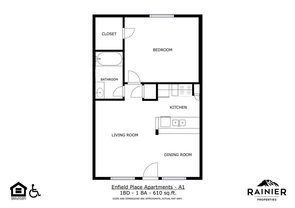 A1 - Floorplan 1 Apartment Unit: 102Apartment Model: A11 Bedroom, 1 Bath, 610 sq ftAvailable December 6, 20251BD/1BA