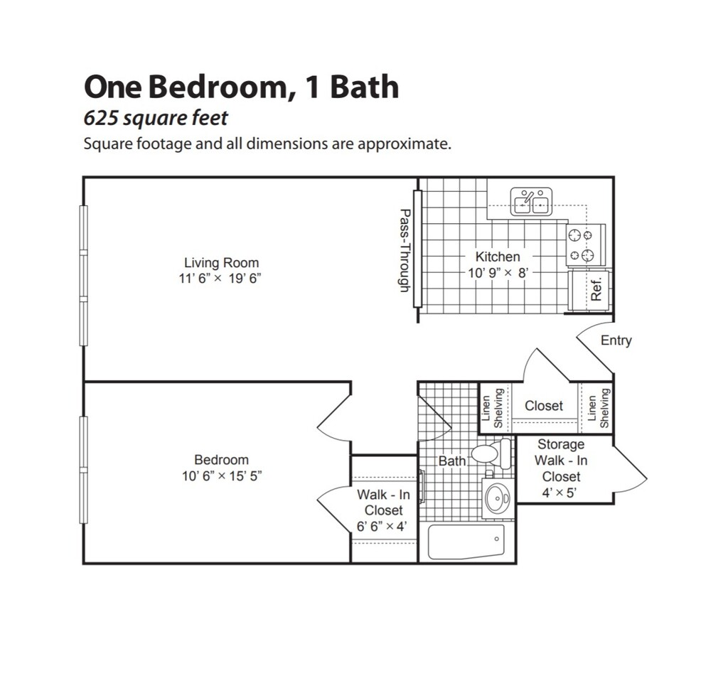 Apartment Model: Renovated 1 Bedroom 1 Bath1 Bedroom, 1 Bath, 625 sq ftAvailable NowFloor plans are artist's rendering. All dimensions are approximate. Actual product and specifications may vary in dimension or detail. Not all features are available in every rental home. Please see a representative for details.