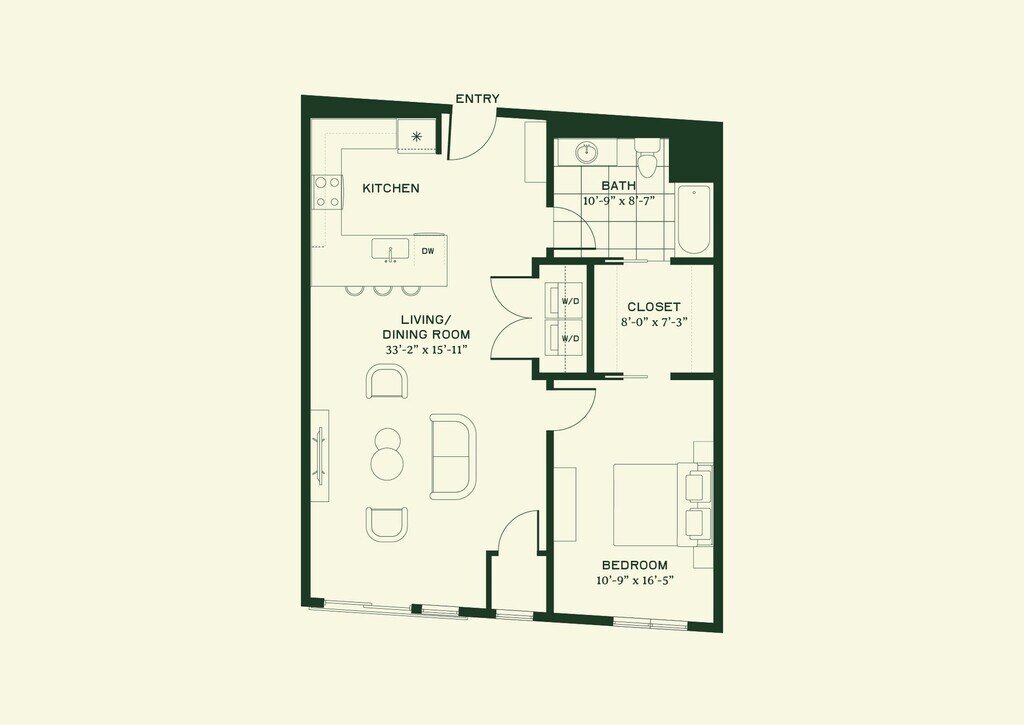 This beautiful one-bedroom home is defined by its long and open living and dining room at 33'2" x 15'11"—a feature that offers flexibility for entertaining, lounging, or creating a dedicated home office zone. The open kitchen anchors the space with a functional peninsula, seating, and efficient layout of the refrigerator, range, and dishwasher, keeping the heart of the home both social and practical. The bedroom is privately positioned and generously sized at 10'9" x 16'5" to accommodate a bed with additional furnishings. A large 8'0" x 7'3" walk-in closet provides ample storage, while the 10'9" x 8'7" full bathroom is comfortably proportioned and conveniently accessible through both the entry and bedroom. Additionally, an in-unit washer and dryer is situated in a dedicated closet between the kitchen and living/dining room. With its open layout and modern conveniences, this residence offers a distinctive one-bedroom experience designed for urban living.