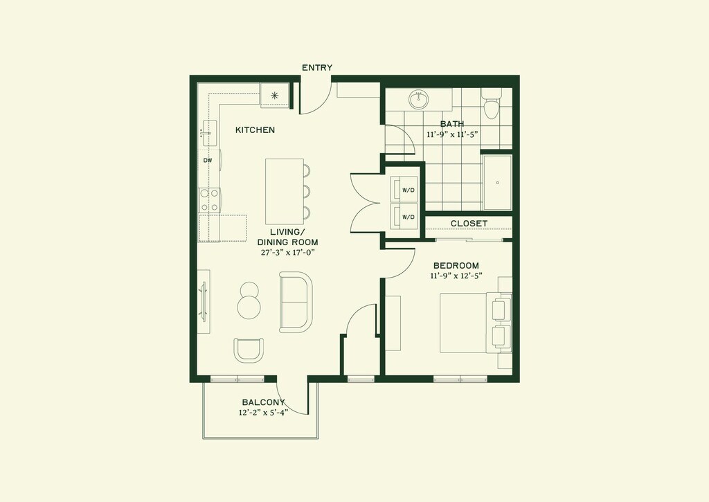 This beautifully arranged one-bedroom apartment offers an exceptional sense of space and flow, anchored by a 27’3" x 17’0" open living and dining room—ideal for entertaining and comfort. The open-concept kitchen features ample cabinetry and modern appliances including a refrigerator, range, and dishwasher. The bedroom comfortably accommodates a bed with room for additional furnishings at 11'9" x 12'5". The bedroom also features a large sliding door closet. At 11'9" x 11'5", the bathroom provides ample room for all toiletry needs. Additional highlights include in-unit washer and dryer situated in a closet between the kitchen and living room and a private balcony sized at 12'2" x 5'4", perfect for fresh air, morning coffee, or an evening wind-down. With its expansive living space, smart separation of private and social areas, and modern conveniences, this residence delivers easy, elevated living designed for today’s lifestyle.