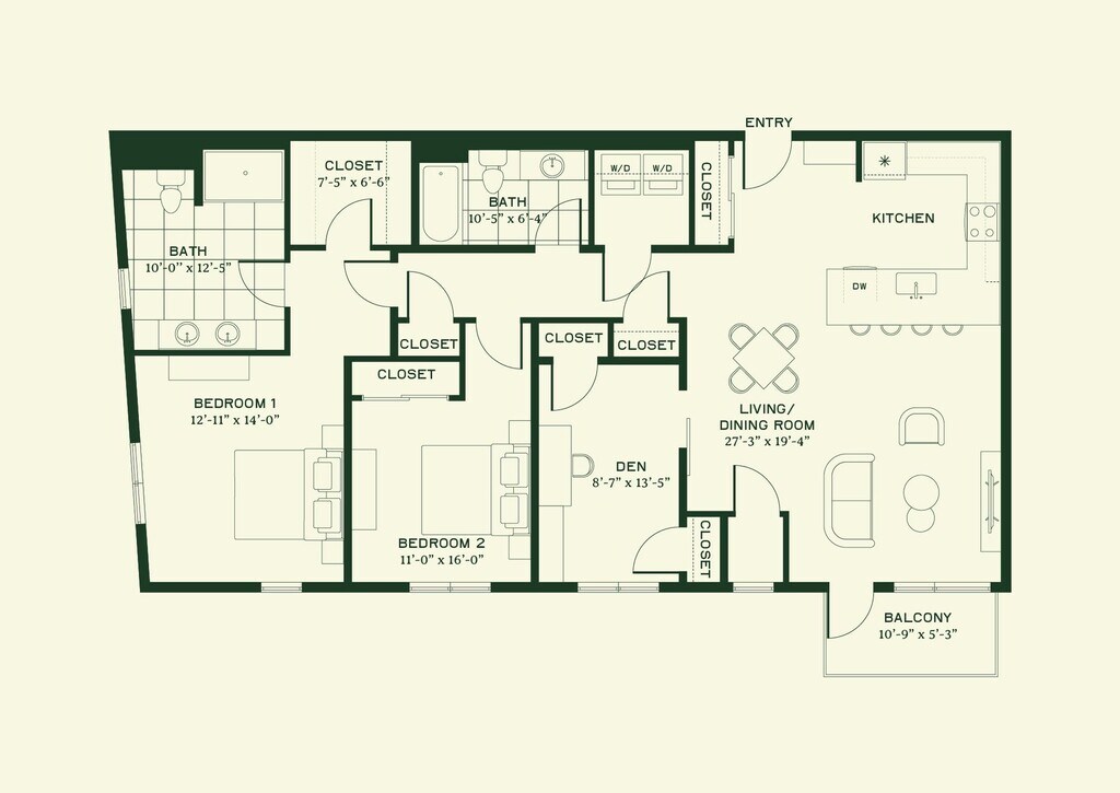 This thoughtfully designed two-bedroom, two-bath residence offers generous proportions and a layout ideal for both everyday living and entertaining. At the heart of the home is a large 27'3" x 14,7" living and dining room, providing ample space for lounging, dining, and hosting, all seamlessly connected to an open kitchen with peninsula seating, abundant counter space, and convenient layout of the refrigerator, range, and dishwasher. The split-bedroom design ensures privacy and flexibility. Bedroom 1 at 12'7" x 19'6" serves as a true primary suite with ample room for a bed, a dedicated closet, and direct access to a private 10'2" x 6'10" 3/4 bath. Bedroom 2 is well-sized at 10'7" x 15'4" and is conveniently located near the second 9'5" x 6'10" full bath, making it ideal for guests, a home office, or shared living arrangements. Additional highlights include a dedicated entry closet and in-unit washer and dryer. With its expansive common space, dual bathrooms, and storage solutions, this home delivers comfort and versatility for modern living.