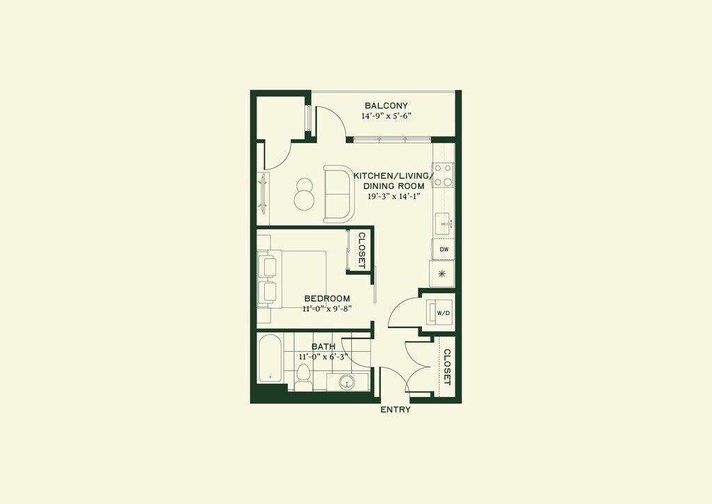 This studio home offers a smart blend of openness and separation, creating a comfortable and highly livable space. The layout features a defined 11'0" x 9'8" sleeping alcove, providing privacy without sacrificing the open feel of a studio, along with a closet conveniently located nearby. The open 19'3" x 14'1" kitchen, living, and dining area is arranged for everyday living and entertaining, complete with a refrigerator, range, and dishwasher, efficient counter space, and room for both lounging and dining. Large windows and direct access to a private 14'9" x 5'6" balcony bring in natural light and extend the living space outdoors—perfect for morning coffee or evening relaxation. Additional highlights include in-unit washer and dryer, ample storage throughout, and a 11'0" x 6'3" full bathroom positioned for easy access while maintaining privacy from the main living area.