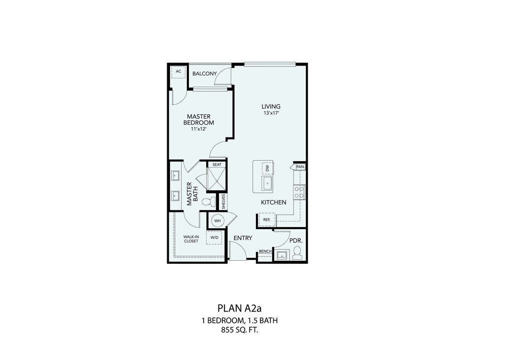 A2a - Floorplan 1 Apartment Unit: 155Apartment Model: A2aFrom $2,5731 Bedroom, 1.5 Bath, 855 sq ftAvailable December 11, 2025Floorplan A2b
