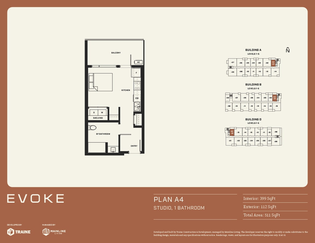Evoke Kitchener offers Studio to 2 Bedroom apartments starting from $1,425 and having 416–895 sq ft. Here is the current pricing and availability: