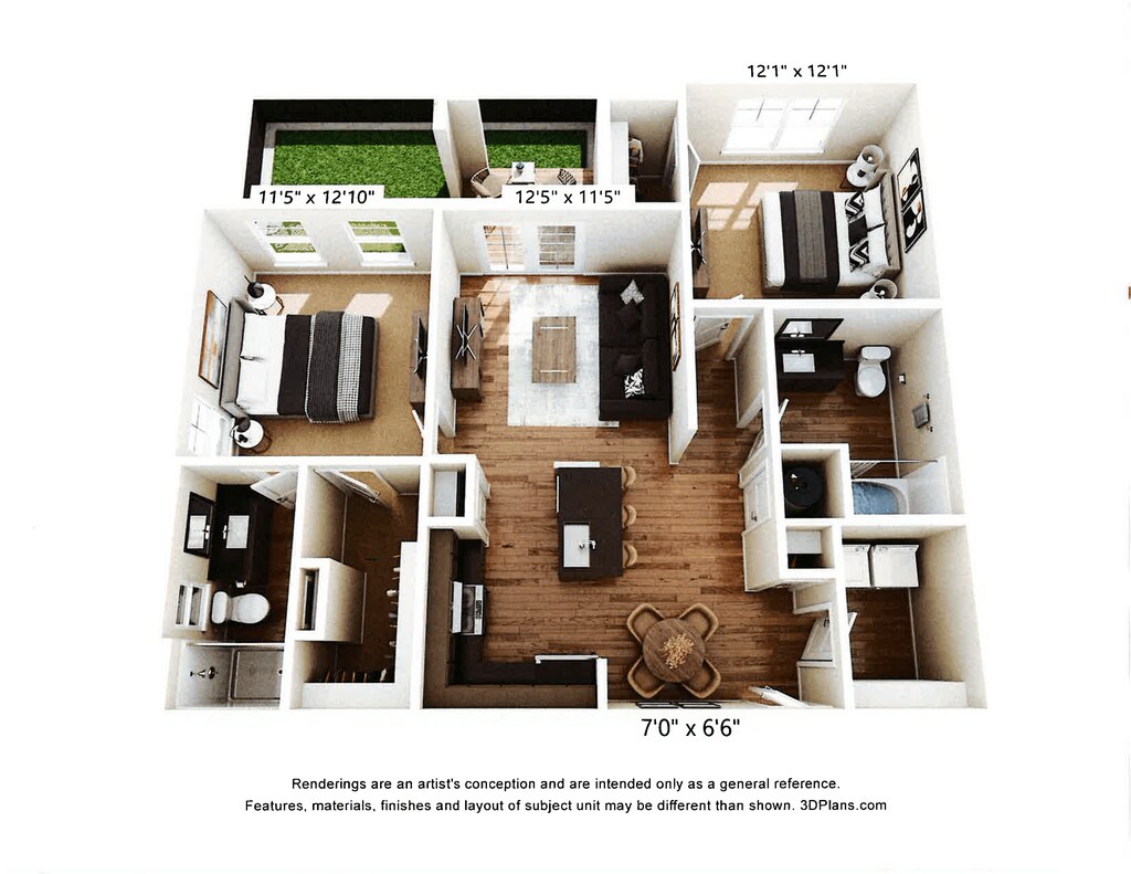 Apartment Model: Two Bed, Two BathFrom $1,6002 Bedroom, 2 Bath, 1064 sq ftAvailable NowFloor plans are artist's rendering. All dimensions are approximate. Actual product and specifications may vary in dimension or detail. Not all features are available in every rental home. Please see a representative for details.