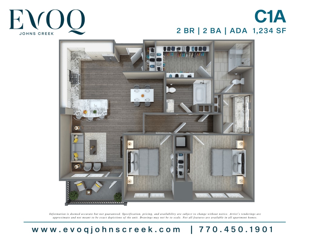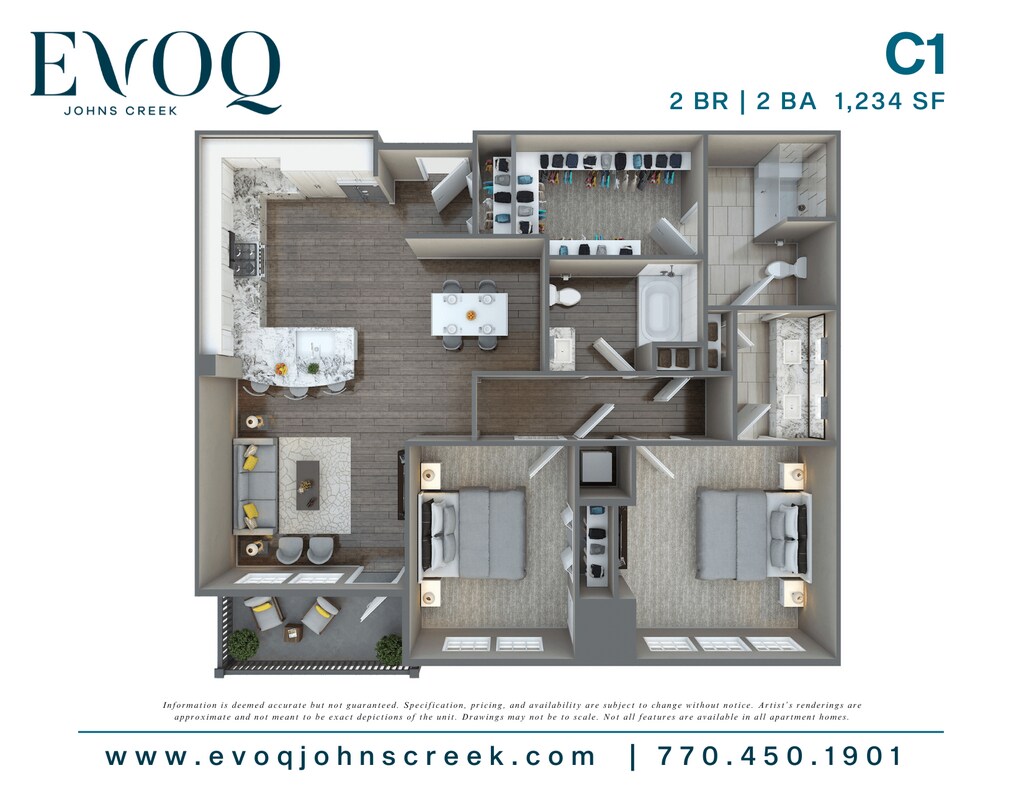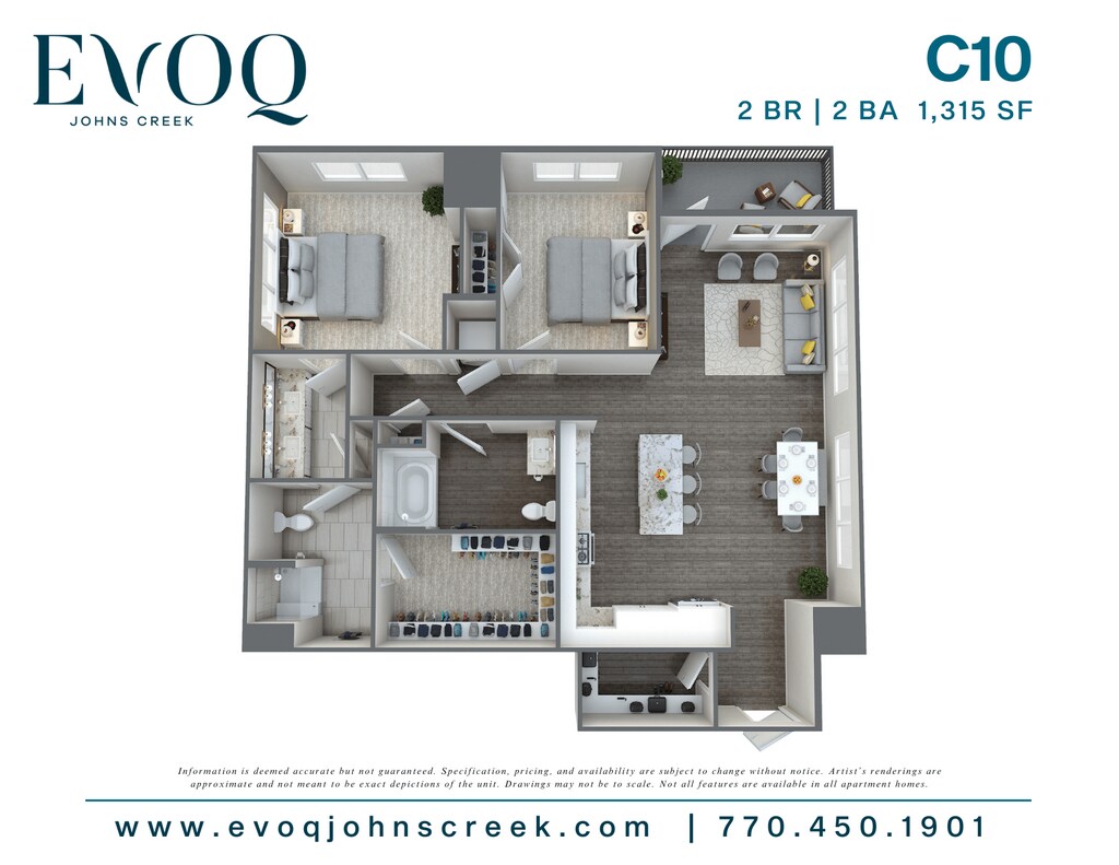 Evoq Johns Creek offers 1 to 2 Bedroom apartments starting from $2,099 and having 786–1,404 sq ft. Here is the current pricing and availability: