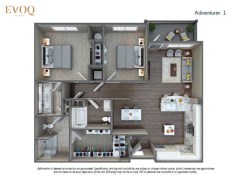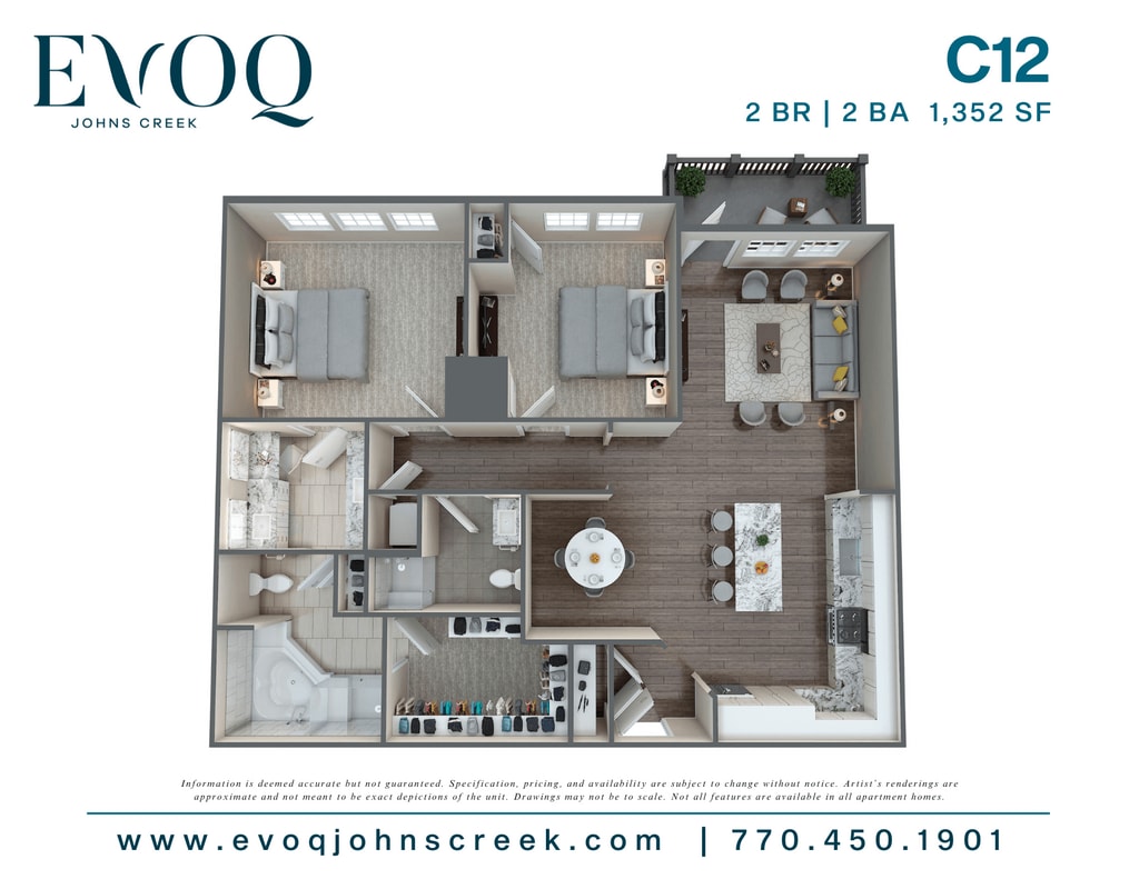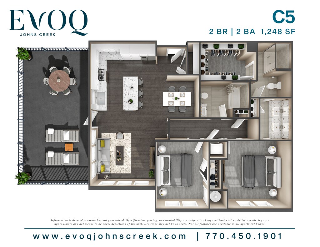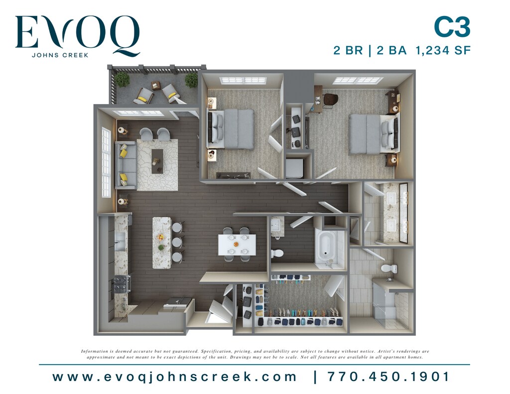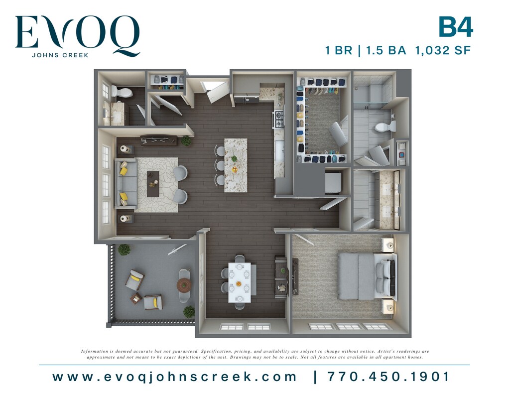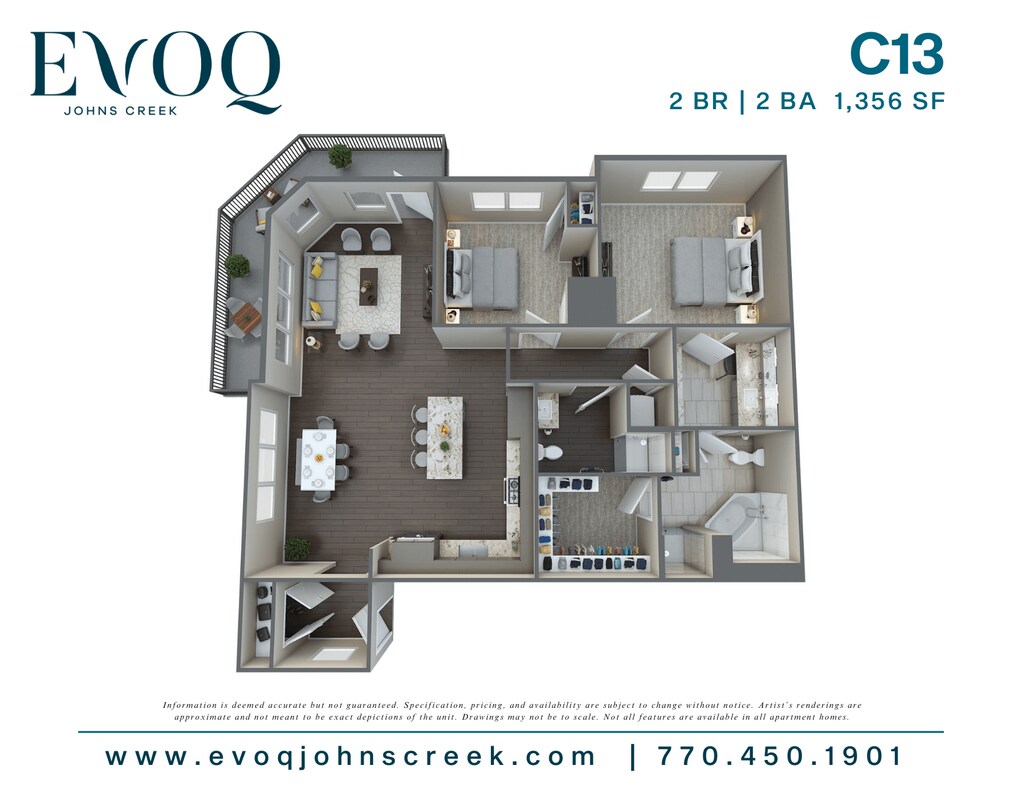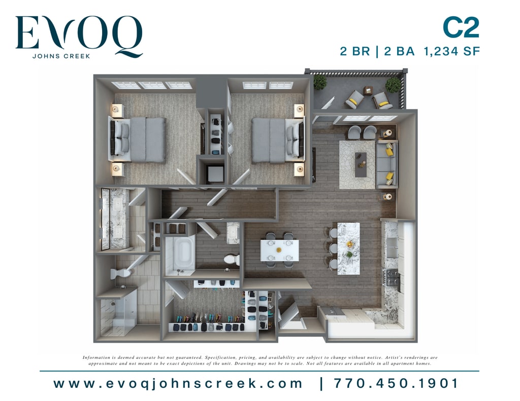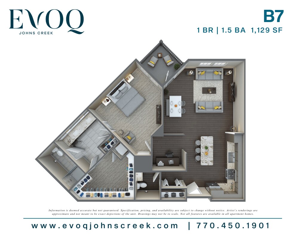 1 Bedroom to 2 Bedroom Apartments at Evoq Johns Creek currently range from $2,099 to $3,542