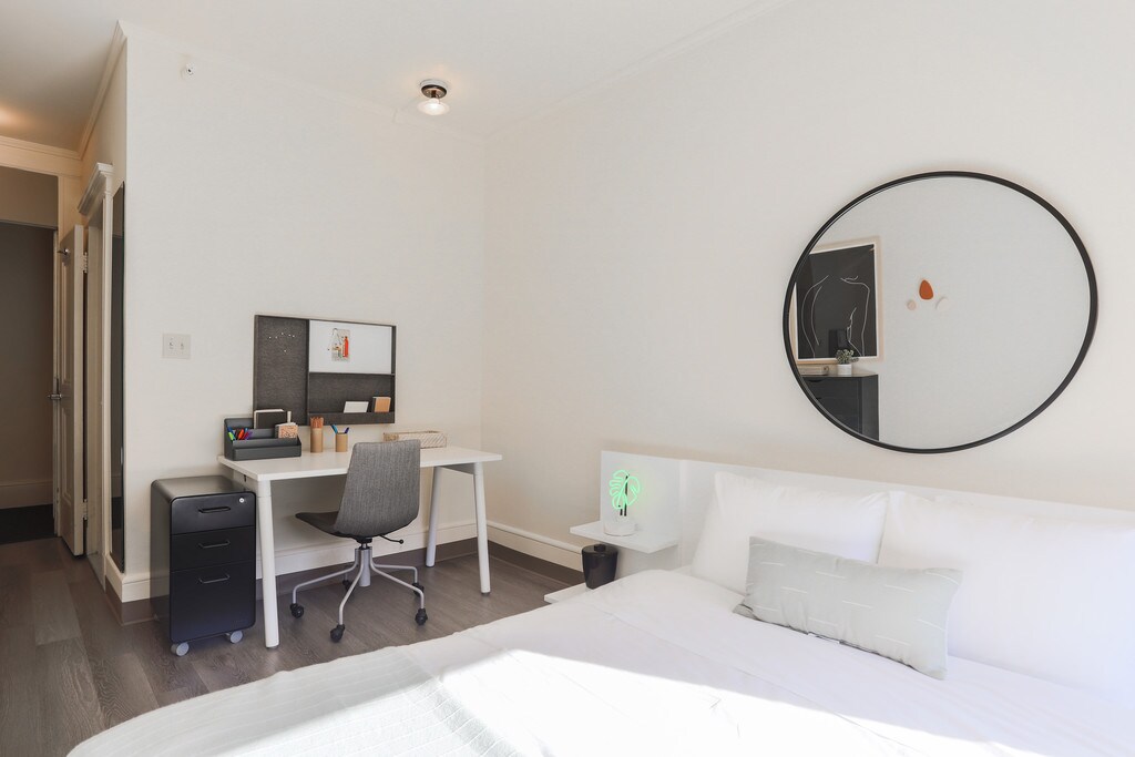 Dedicated Student and Intern Housing. We require proof of enrollment in a college/university or proof of internship acceptance for university credit. *Double room listings are for shared dorm-style bedrooms and the price listed above is per person/per bed* Our rental price includes furniture, high-speed wifi, and all utilities. Move-in ready! FOUND Study San Francisco offers fully furnished, turnkey private, and shared accommodations with private bathrooms and showers in our centrally located co-living community. Residents enjoy communal amenities, including lounges, laundry, kitchens, and access to FOUND promotions, discounts, and other services. LOCATION: Located in the mid-market area of Downtown San Francisco, FOUND Study San Francisco is close to public transportation, eateries, and shopping centers. - Bart: 2 min walk - Tram: 2 min walk - Grocery Stores: 6 min walk Let us help you make your move a seamlessly enjoyable experience with virtual tours and a quick online application and approval process.