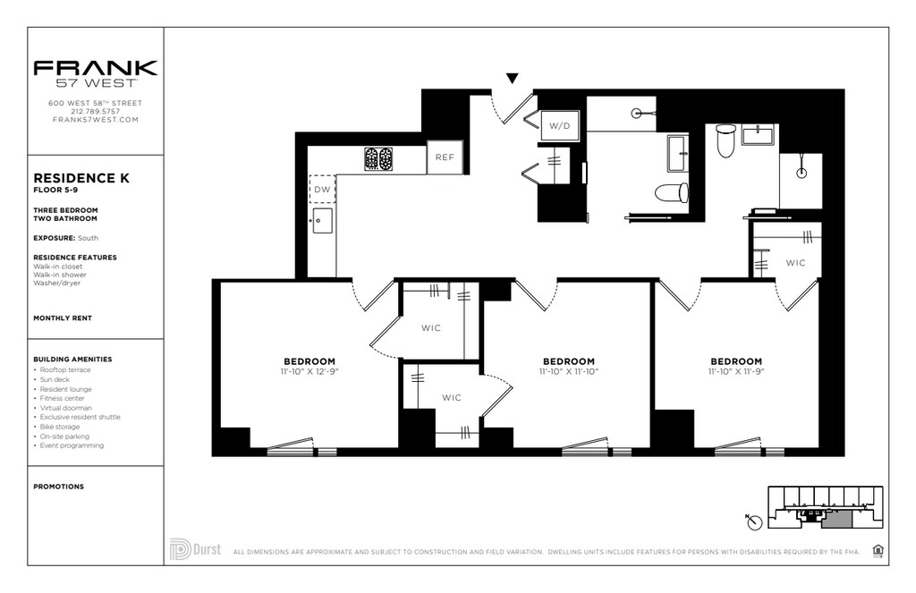 FRANK 57 WEST offers a spacious selection of one, two and three-bedroom apartments that carefully balance architectural finishes with sustainable building features to enhance resident wellness. FRANK 57 WEST offers an urban lifestyle in the heart of Manhattan. The handsome zinc-clad building blends green living with premium amenities and convenient on-site retail, providing a space for residents to thrive. Comprehensive building amenities and a creative event series add another dimension to resident lifestyles. Each aspect of the design and construction has been thoughtfully planned to conserve water, reduce energy needs, and promote resident wellness, while minimizing environmental impact. FRANK Amenities: · New Development · No Fee · Rent Stabilized · Fitness Center · Roof Deck · Resident Lounge · Elevator · Package Concierge · Parking Garage · No Pets Allowed · Bike Storage · Shuttle Service to Columbus Circle · Smoke Free Building · Onsite Management · Community Events and Outings Each home at FRANK 57 WEST has a Boshe washer and dryer, kitchen with custom cabinetry, energy star Blomberg refrigerator and dishwasher and Bertazoni range. FARE Act Disclosure. This listing is intended to be used by prospective renters and may not be republished without the prior written consent of The Durst Organization. Absent an express written agreement or acknowledgment to the contrary, The Durst Organization and its affiliates (1) do not utilize the services of third-party brokers or agents in connection with the rental of residential apartments and (2) will not assume responsibility for any brokerage fees incurred by a prospective renter. The Durst Organization and its affiliates will not charge or collect fees from a prospective renter except for such fees as permitted by law and disclosed to the prospective renter.