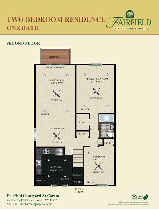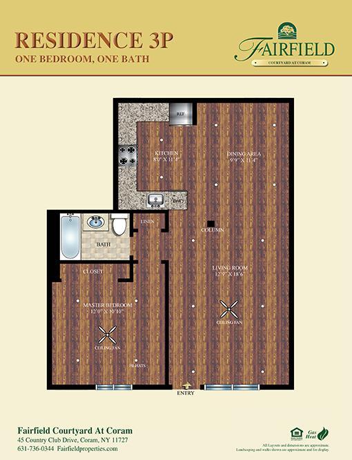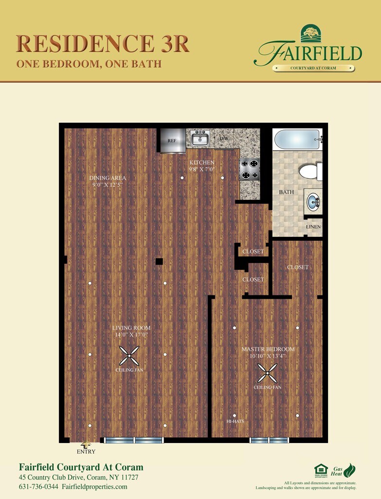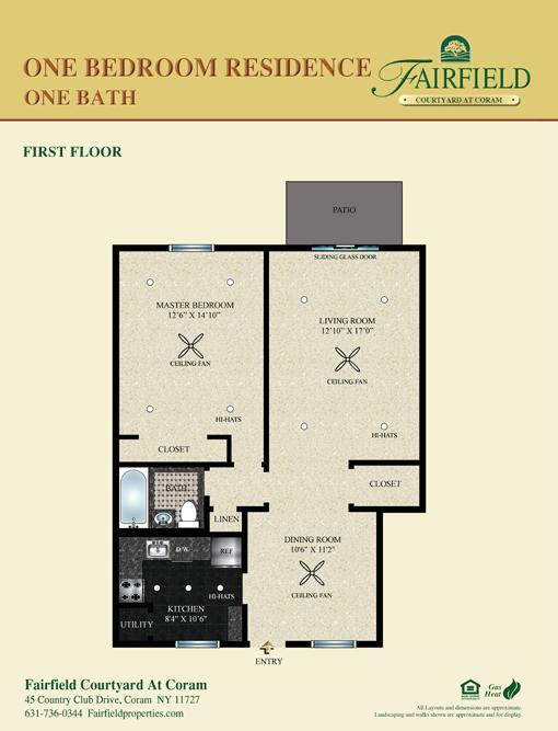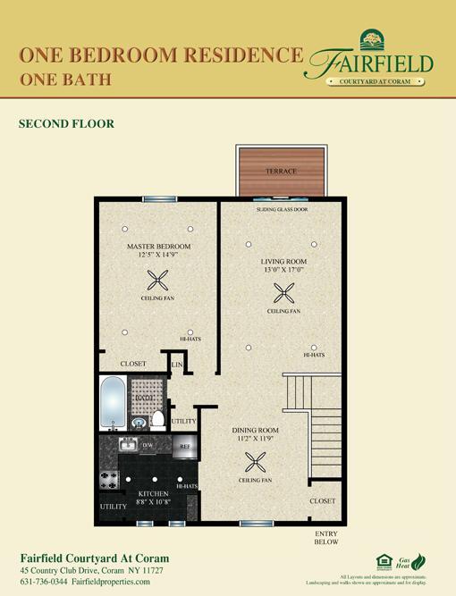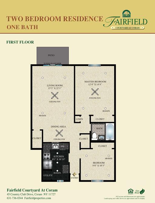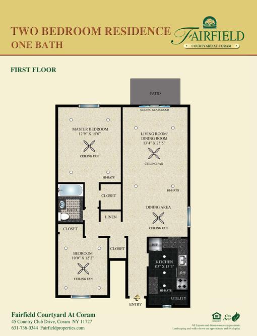 Lease Any Apt With No Rent Until 12/1/25!* PLUS Floor Plan Specials: Magnolia $2225.Lavender $2225.Marigold $2595.Larkspur $2650. Reverie $2725.Pandora $2765. 18 Mth Same Rent as 12-Mth* *99 Security Deposit. *Restrictions apply. Welcome to Fairfield Courtyard At Coram. Our updated apartment homes feature granite kitchen countertops/kitchen floor, stainless steel appliances and Tuscany cabinetry. High-hat lighting, ceiling fans, two-tone paint with crown and base molding, some with plush carpeting, some with vinyl plank flooring, raised panel doors, new lighting, bath with granite vanitytop, frameless bath shower doors and rain showerhead. Amenities: central air conditioning, customizable closets, large outdoor terraces, ample parking.ONE BEDROOM/ONE BATH: 765-830 SQ.FT.TWO BEDROOM/ONE BATH: 825-980 SQ.FT.Fairfield Courtyard At Coram residents enjoy a private clubhouse with fitness center, billiards, clubhouse lounge, outdoor swimming pool w