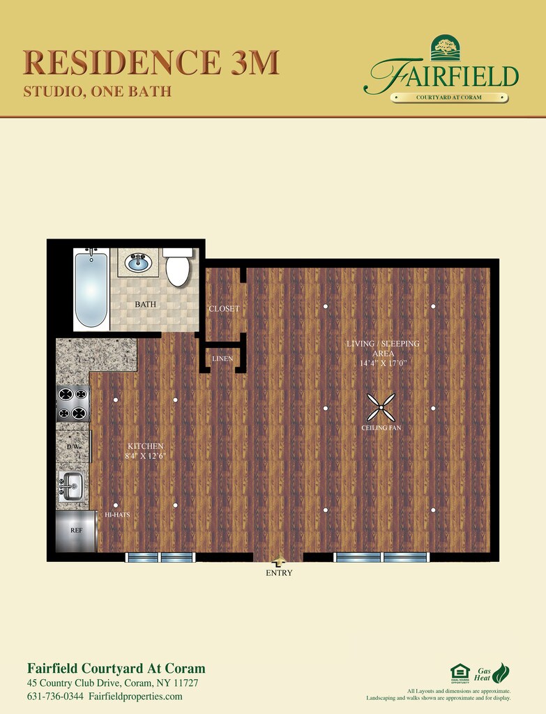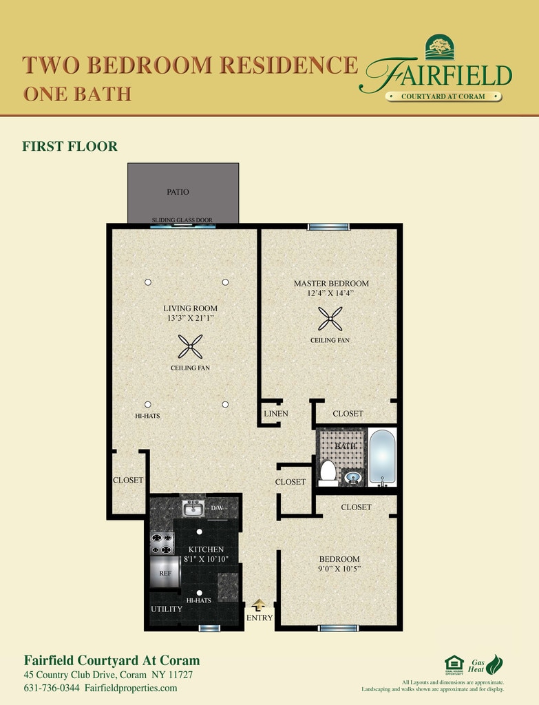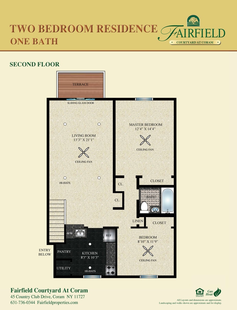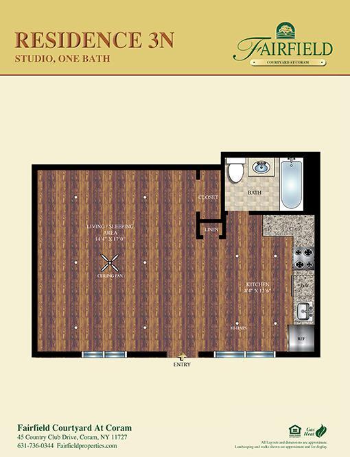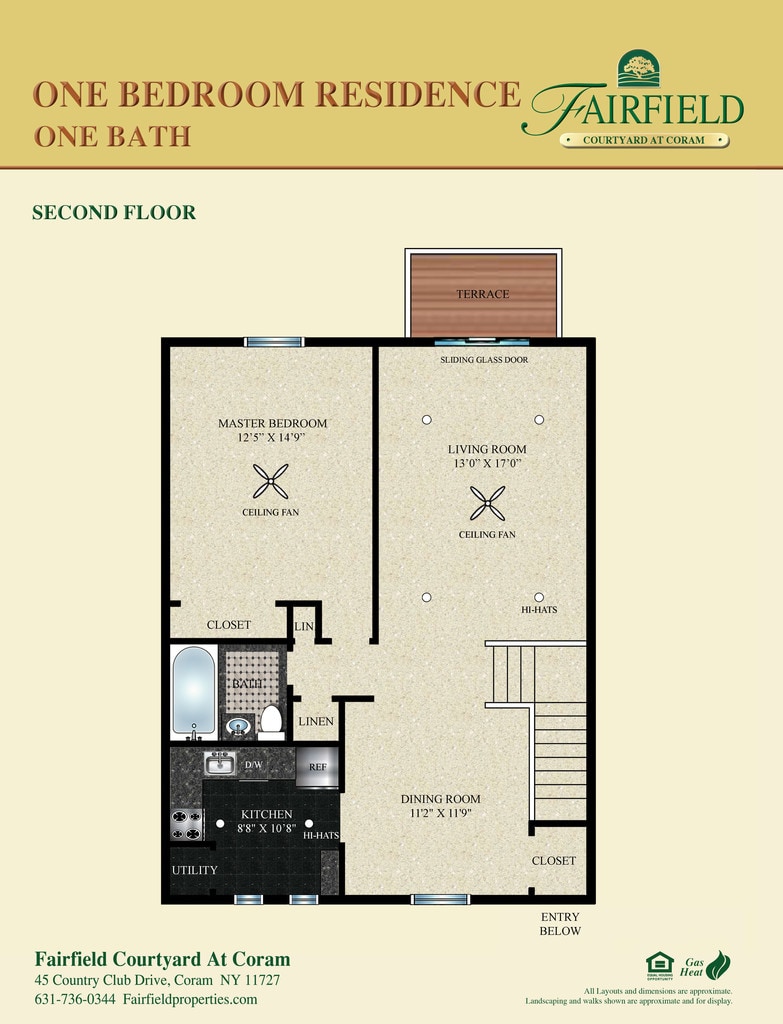 Lease Any Apt With No Rent Until 12/1/25!* PLUS Floor Plan Specials: Magnolia $2225.Lavender $2225.Marigold $2595.Larkspur $2650. Reverie $2725.Pandora $2765. 18 Mth Same Rent as 12-Mth* *99 Security Deposit. *Restrictions apply. Welcome to Fairfield Courtyard At Coram. Our updated apartment homes feature granite kitchen countertops/kitchen floor, stainless steel appliances and Tuscany cabinetry. High-hat lighting, ceiling fans, two-tone paint with crown and base molding, some with plush carpeting, some with vinyl plank flooring, raised panel doors, new lighting, bath with granite vanitytop, frameless bath shower doors and rain showerhead. Amenities: central air conditioning, customizable closets, large outdoor terraces, ample parking.ONE BEDROOM/ONE BATH: 765-830 SQ.FT.TWO BEDROOM/ONE BATH: 825-980 SQ.FT.Fairfield Courtyard At Coram residents enjoy a private clubhouse with fitness center, billiards, clubhouse lounge, outdoor swimming pool w