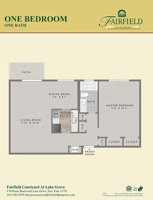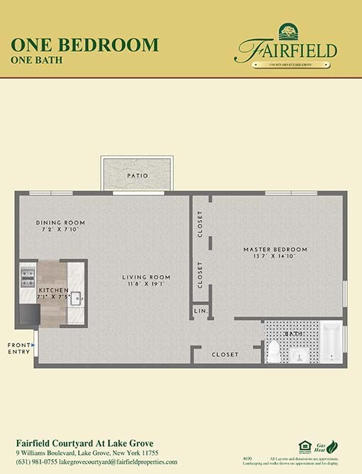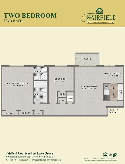 View our luxurious, modern interiors that our one- and two-bedroom apartment residences have to offer. We proudly feature modern quartz kitchen countertop and backsplash, gourmet Whirlpool Gold Series stainless steel appliances and shaker-style wood cabinets with under cabinet mounted led lighting and plank floors. Front load washer/dryer and customizable ELFA closet system. Ceiling fans and hi-hat lighting throughout, in unit washer and dryer, air conditioning and faux woodgrain two-inch window treatments. Gray wall paint, plush gray carpeting, crown/base molding. Our hotel-style baths have marble tile floor, quartz vanity top, frameless shower doors. Relax and enjoy our swimming pool and sundeck, playground, picnic area, and gazebo. Clubhouse has on-site fitness center, great room. We have a car care area. Close to SUNY Stonybrook, Smith Haven Mall. Middle Country schools. Long Island Rail Road minutes away. Fairfield Courtyard At Lake Grove is also near Jericho Turnpike/Route 25. Off-street parking and Verizon FiOS are available. Cats and dogs are welcome.