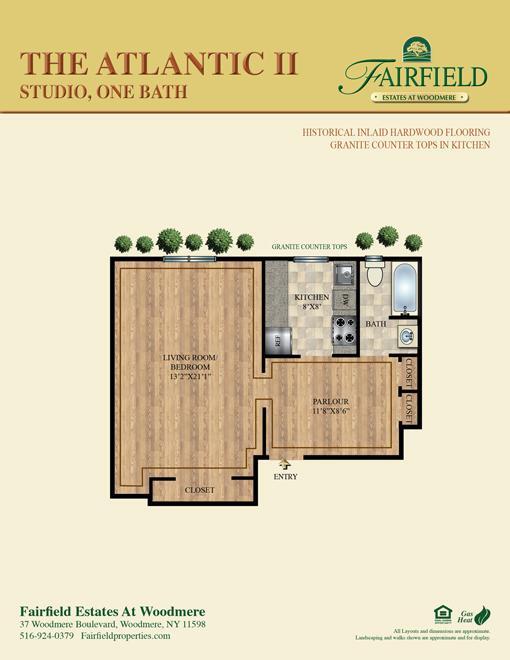 Fairfield Estates At Woodmere a stately stone building with its historic charm is located in a lovely residential neighborhood. Close to the Long Island Railroad and many shops and trendy restaurants in the "five-towns".Our spacious Studio, One and Two bedroom apartment homes are newly renovated with beautiful Tuscany-style cabinetry, stainless steel appliances, ceramic tile, crown and base molding, two-tone paint, air conditioning, ceiling fan and plush carpeting. Our luxurious, grand hotel-style lobby is a furnished with elegant lighting, mirror accents, manhattan style seating and accessible with fob entry and door intercom.