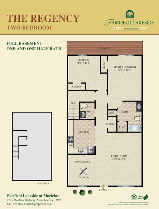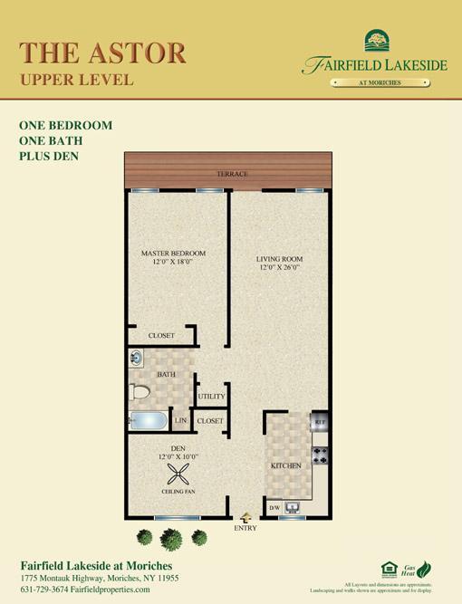 55 And Over Rental Community$99 Security Deposit* *Restrictions apply. Beautiful ledgestone exterior. Fairfield Lakeside At Moriches offers luxury, private entry, one bedroom with one bath plus den and two bedroom with 1.5 baths plus basement. Large terrace. Convenient location, near shops, public transportation, local beaches and community activities.