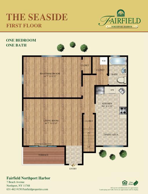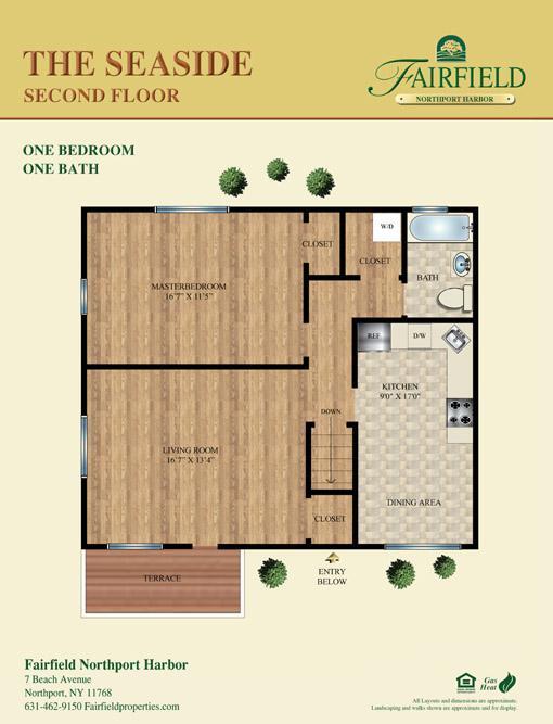 Historic Northport Village. Fairfield Harbor offers outstanding views, spacious apartment homes, exceptional interiors. Terrace or Patio. Washer and dryer in each apartment.One Bedroom residences with heat and hot water included. Each apartment features stainless appliances, high-hat lighting, ceiling fans, gray wall paint, carpeting, ceramic tile bath with updated cabinetry, air conditioning, updated lighting, crown/base molding, raised panel doors.